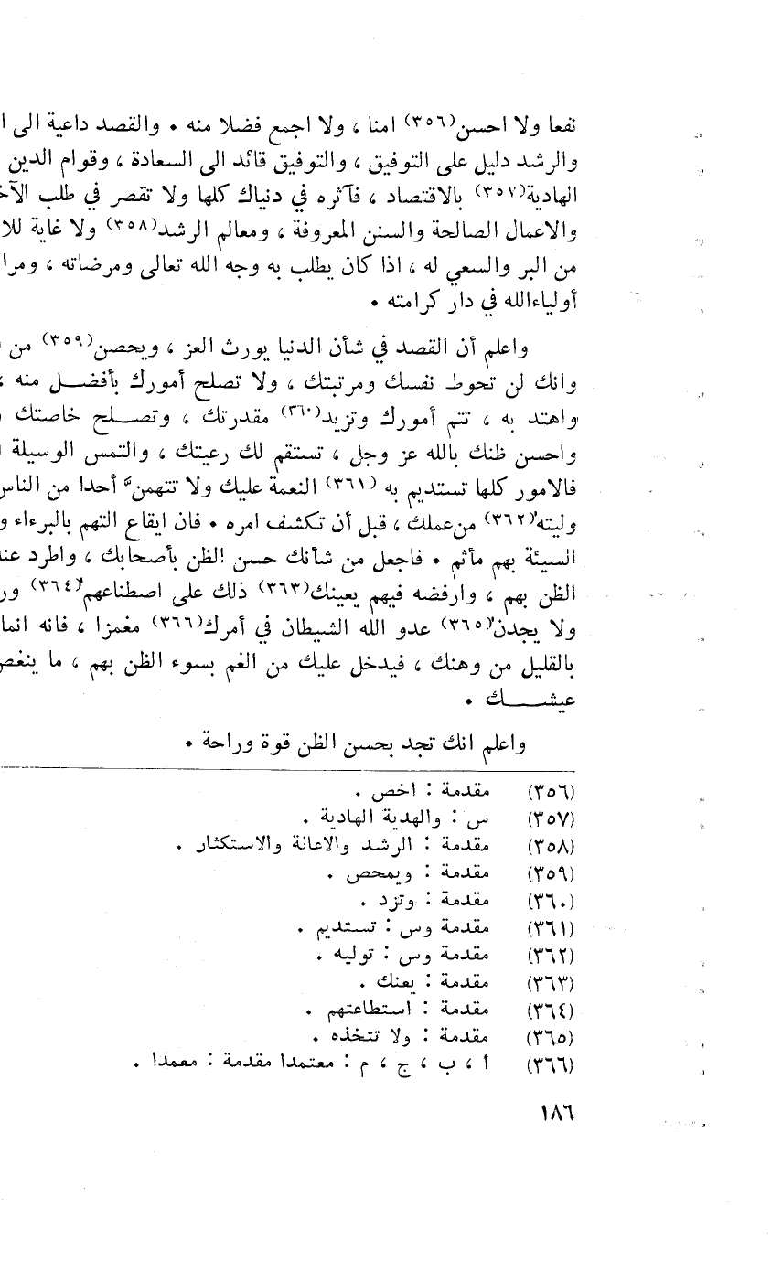 نفعا وَلَا احسن امنا وَلَا اجْمَعْ فضلا مِنْهُ وَالْقَصْد دَاعِيَة إِلَى الرشد والرشد دَلِيل على التَّوْفِيق قَائِد إِلَى السَّعَادَة وقوام الدّين وَالسّنَن الهادية بالاقتصاد فاثره فِي دنياك كلهَا وَلَا تقصر فِي طلب الاخرة والأعمال الصَّالِحَة وَالسّنَن الْمَعْرُوفَة ومعالم الرشد ولاغاية للاستكثار من الْبر وَالسَّعْي لَهُ إِذا كَانَ يطْلب بِهِ وَجه الله تَعَالَى ومرضاته ومرافقة اولياء الله فِي دَار كرامته