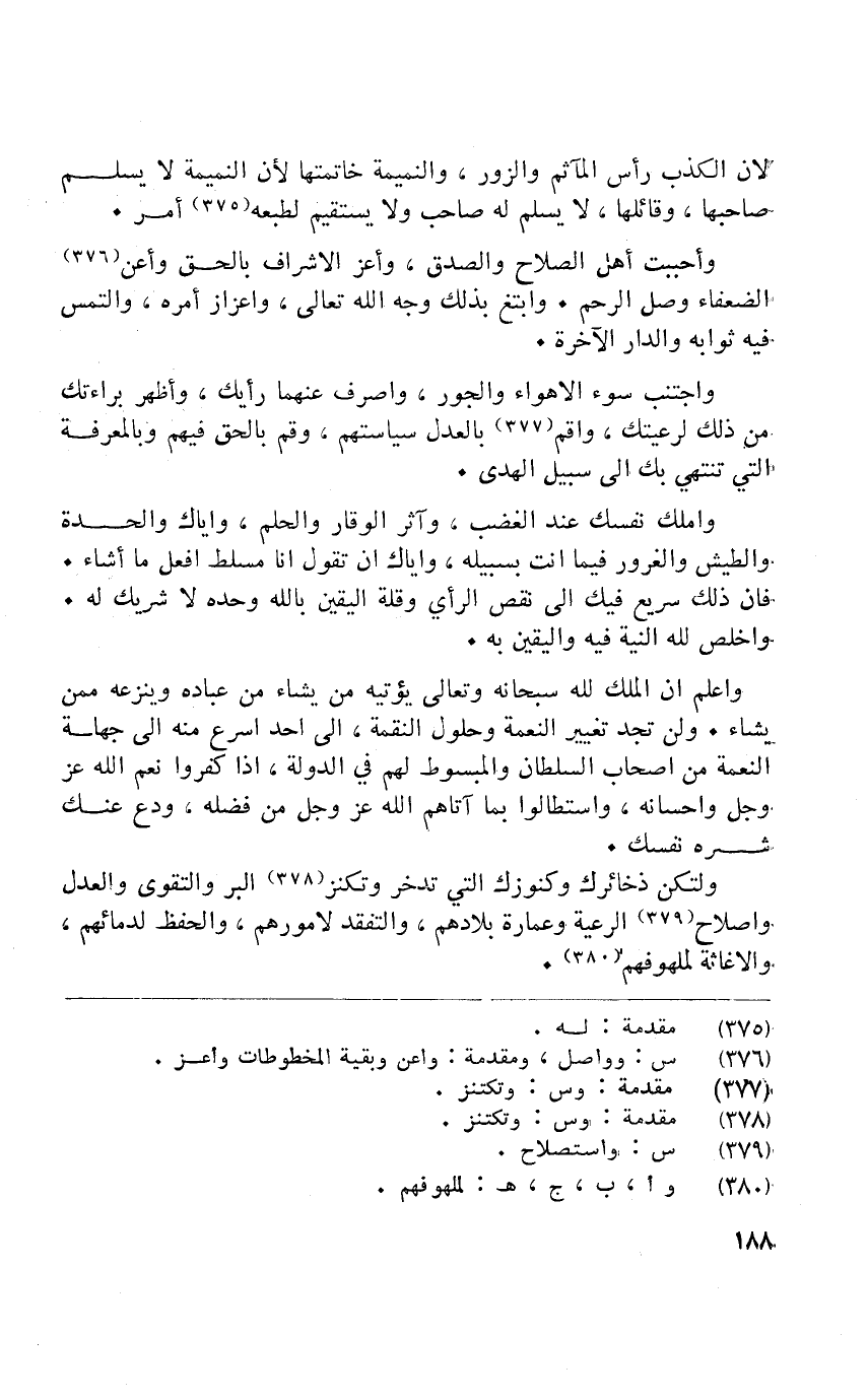 ولتكن ذخائرك وكنوزك الَّتِي تدخر وتكنز الْبر وَالتَّقوى وَالْعدْل واصلاح الرّعية وَعمارَة بِلَادهمْ والتفقد لأمورهم وَالْحِفْظ لدمائهم والاغاثة للمهوفهم
