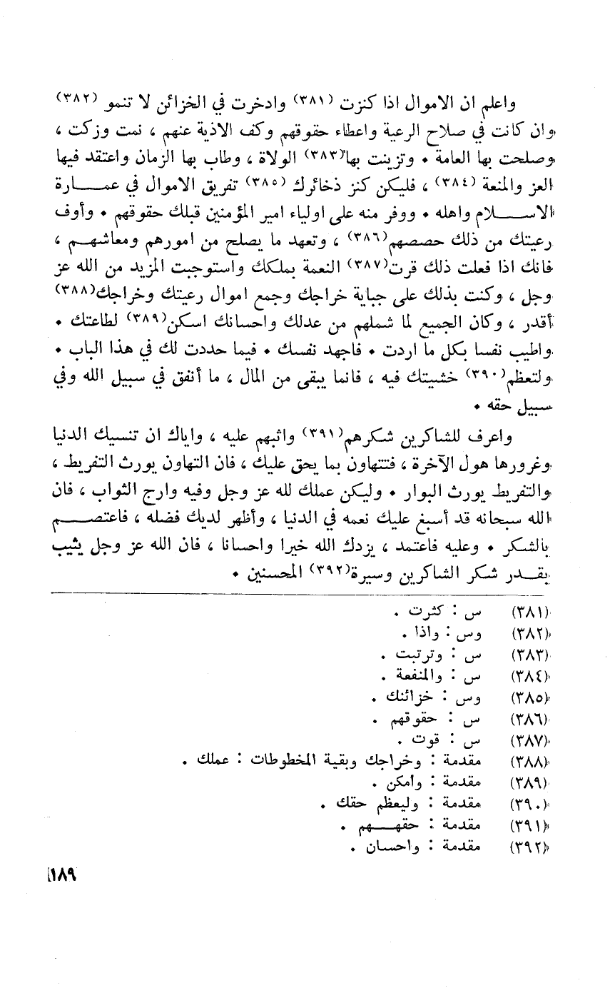 وَاعْلَم أَن الْأَمْوَال إِذا كنزت وادخرت فِي الخزائن لَا تنمو وان كَانَت فِي صَلَاح الرّعية واعطاء حُقُوقهم وكف الاذى عَنْهُم نمنت وزكت وصلحت بهَا الْعَامَّة وتزينت بهَا الْوُلَاة وطاب بهَا الزَّمَان واعتقد الْعِزّ والمنعة فَلْيَكُن كنز ذخائرك تَفْرِيق الْأَمْوَال فِي عمَارَة الْإِسْلَام واهله ووفر مِنْهُ على اولياء امير الْمُؤمنِينَ قبلك حُقُوقهم واوف رعيتك من ذَلِك حصصهم وتعهد مَا يصلح من امورهم ومعاشهم فانك إِذا فعلت ذَلِك قرت النِّعْمَة بملكك واستوجبت الْمَزِيد من الله عز وَجل وَكنت بذلك على جبابة خراجك وَجمع أَمْوَال رعيتك وخراجك اقدر وَكَانَ الْجَمِيع لما شملهم من عدلك واحسانك اسكن لطاعتك واطيب نفسا بِكُل مَا اردت فاجهد نَفسك فِيمَا حددت لَك فِي هَذَا الْبَاب ولتعظم خشيتك فِيهِ فَإِنَّمَا يبقي من المَال مَا انفق فِي سَبِيل الله وَفِي سَبِيل حَقه