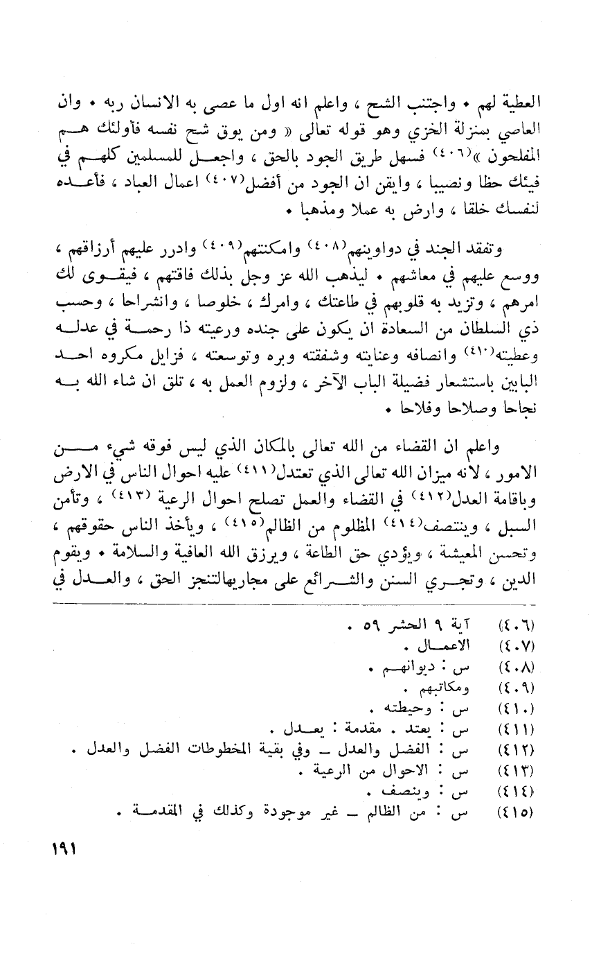 وتفقد الْجند فِي دواوينهم وامكنتهم وادرر عَلَيْهِم ارزاقهم ووسع عَلَيْهِم فِي معاشهم ليذْهب الله عز وَجل بذلك فاقتهم فيقوى لَك أَمرهم وتزيد بِهِ قُلُوبهم فِي طَاعَتك وامرك خلوصا وانشراحا وَحسب ذِي السُّلْطَان من السَّعَادَة أَن يكون على جنده ورعيته إِذا رَحْمَة فِي عدله وعطيته وانصافه وعنايته وشفقته وبره وتوسعته فزايل مَكْرُوه أحد الْبَابَيْنِ باستشعار فَضِيلَة الْبَاب الآخر وَلُزُوم الْعَمَل بِهِ تلق أَن شَاءَ الله بِهِ نجاحا وصلاحا وفلاحا