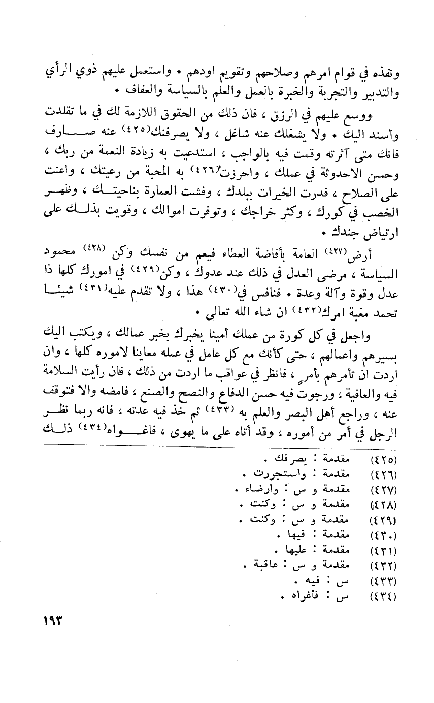 ووسع عَلَيْهِم فِي الرزق فان ذَلِك من الْحُقُوق اللَّازِمَة لَك فِي مَا تقلدت وَاسْنِدِ اليك وَلَا يشغلك عَن شاغل وَلَا يصرفنك عَنهُ صَارف فانك مَتى اثرته وَقمت فِيهِ بِالْوَاجِبِ استدعيت بِهِ زِيَادَة النِّعْمَة من رَبك وَحسن الاحدوثة فِي عَمَلك واحرزت بِهِ الْمحبَّة من رعيتك واعنت على الصّلاح فَدرت الْخيرَات ببلدك وفشت الْعِمَارَة بناحيتك وَظهر الخصب فِي كورك وَكثر خراجك وتوفرت اموالك وقويت بذلك على ارتياض جندك