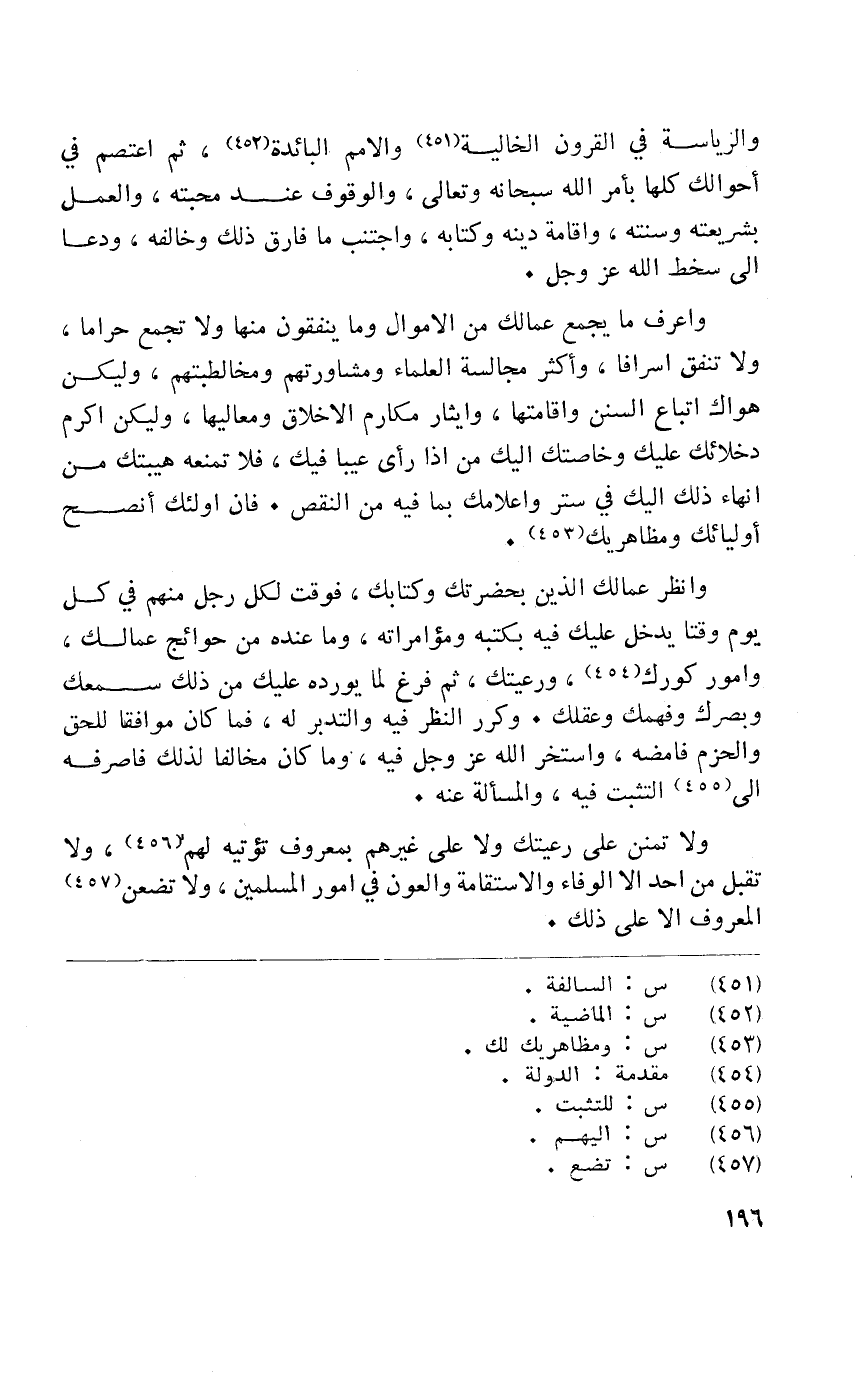 واعرف مَا يجمع عمالك من الْأَمْوَال وَمَا يُنْفقُونَ مِنْهَا وَلَا تجمع حَرَامًا وَلَا تنْفق اسرافا واكثر مجالسة الْعلمَاء ومشاورتهم ومخالطبتهم وَليكن هَوَاك اتِّبَاع السّنَن واقامتها وايثار مَكَارِم الاخلاق ومعاليها وَليكن اكرم دخلائك عَلَيْك وخاصتك اليك من إِذا رأى عَيْبا فِيك فَلَا تَمنعهُ هيبتك من انهاء ذَلِك اليك فِي ستر واعلامك بِمَا فِيهِ من النَّقْص فان أُولَئِكَ انصح اوليائك ومظاهريك