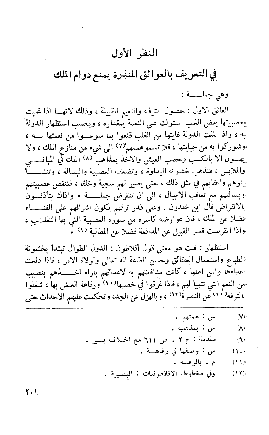 استظهار قلت هُوَ معنى قَول أفلاطون الدول الطوَال تبتدأ بخشونة الطباع وَاسْتِعْمَال الْحَقَائِق وَحسن الطَّاعَة لله تَعَالَى ولولاة الْأَمر فَإِذا دفعت أعداءها وَأمن أَهلهَا كَانَت مدافعتهم بِهِ لَا عدائهم بازاء اخذهم بِنَصِيب من النعم الَّتِي تتهيأ لَهُم فَإِذا غرقوا فِي خصبها ورفاهة الْعَيْش بهَا شغلوا بالترفه عَن النُّصْرَة وبالهزل عَن الْجد وتحكمت عَلَيْهِم الْأَحْدَاث حَتَّى