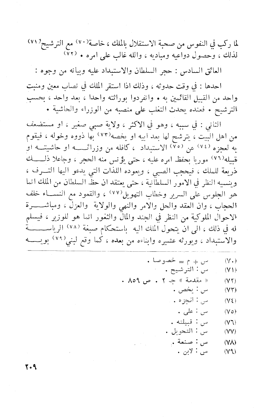 الثَّانِي فِي سَببه وَهُوَ فِي الاكثر ولَايَة صبي صَغِير أَو مستضعف من أهل الْبَيْت يترشح لَهَا بعد ابيه أَو يخصمه بهَا ذووه وخوله فَيقوم بِهِ لعَجزه عَن الاستبداد كافله من وزرائه أَو حَاشِيَته أَو قَبيلَة موريا بِحِفْظ امْرَهْ عَلَيْهِ حَتَّى يؤنس مِنْهُ الْحجر وجاعلا ذَلِك ذَرِيعَة للْملك فيحجب الصَّبِي ويعوده اللَّذَّات الَّتِي يَدْعُو اليها الترف وينسيه النّظر فِي الْأُمُور السُّلْطَانِيَّة حَتَّى يعْتَقد أَن حَظّ السُّلْطَان من الْملك إِنَّمَا هُوَ الْجُلُوس على السرير وخطاب التهويل وَالْقعُود مَعَ النِّسَاء خلف الْحجاب وان العقد والحل وَالْأَمر وَالنَّهْي وَالْولَايَة والعزل ومباشرة الاحوال الملوكية من النّظر فِي الْجند وَالْمَال والثغور إِنَّمَا هُوَ للوزير فَيسلم لَهُ فِي ذَلِك إِلَى أَن يتَحَوَّل الْملك اليه باستحكام صبغة الرياسة والاستبداد ويورثه عشيره وابناءه من بعده كَمَا وَقع لبني بويه