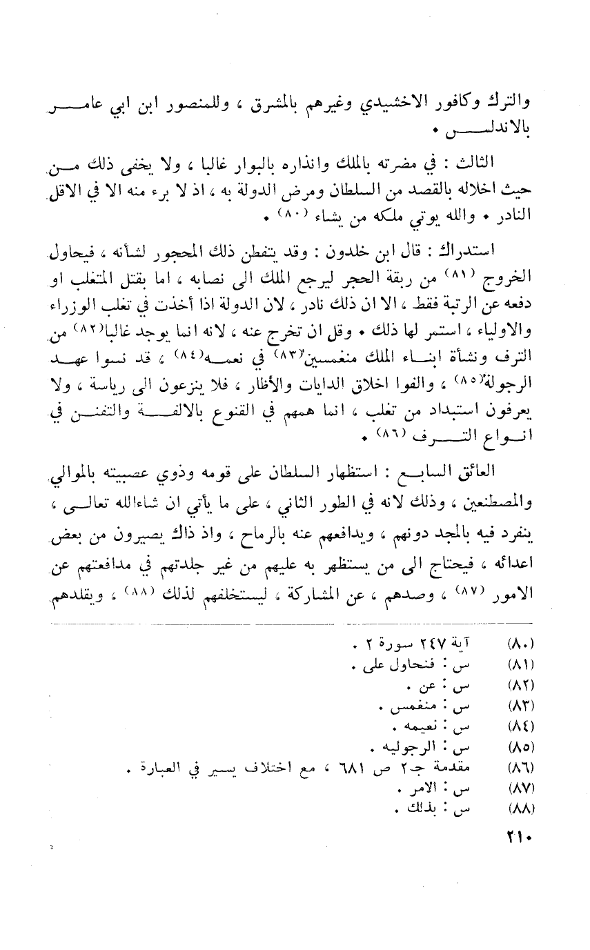 اسْتِدْرَاك قَالَ ابْن خلدون وَقد يتقطن ذَلِك الْمَحْجُور لشأنه فيحاول الْخُرُوج من ربقة الْحجر ليرْجع الْملك إِلَى نصابه إِمَّا بقتل المتغلب أَو دَفعه عَن الرُّتْبَة فَقَط إِلَّا أَن ذَلِك نَادِر لِأَن الدولة إِذا أخذت فِي تغلب الوزراء والأولياء اسْتمرّ لَهَا ذَلِك وَقل أَن تخرج عَنهُ لانه إِنَّمَا يُوجد غَالِبا من الترف ونشأة ابناء الْملك منغمسين فِي نعْمَة قد نسوا عهد الرجولة والفوا اخلاق الدِّيات والاظار فَلَا ينزعون إِلَى رياسة وَلَا يعْرفُونَ استبداد من تغلب إِنَّمَا هَمهمْ فِي القنوع بالألفة والتفنن فِي أَنْوَاع الترف