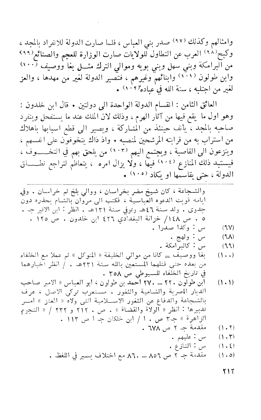 وامثالهم وَكَذَلِكَ صدر بن الْعَبَّاس فَلَمَّا صَارَت الدولة للانفراد بالمجد وكبح الْعَرَب عَن التطاول للولايات صَارَت الوزارة للعجم والصنائع من البرامكة وَبني سهل وَبني بويه وموالي التّرْك مثل بغا ووصيف وَابْن طولون وابنائهم وَغَيرهم فَتَصِير الدولة لغير من مهدها والعز لغير من اجتلبه سنة الله فِي عبَادَة