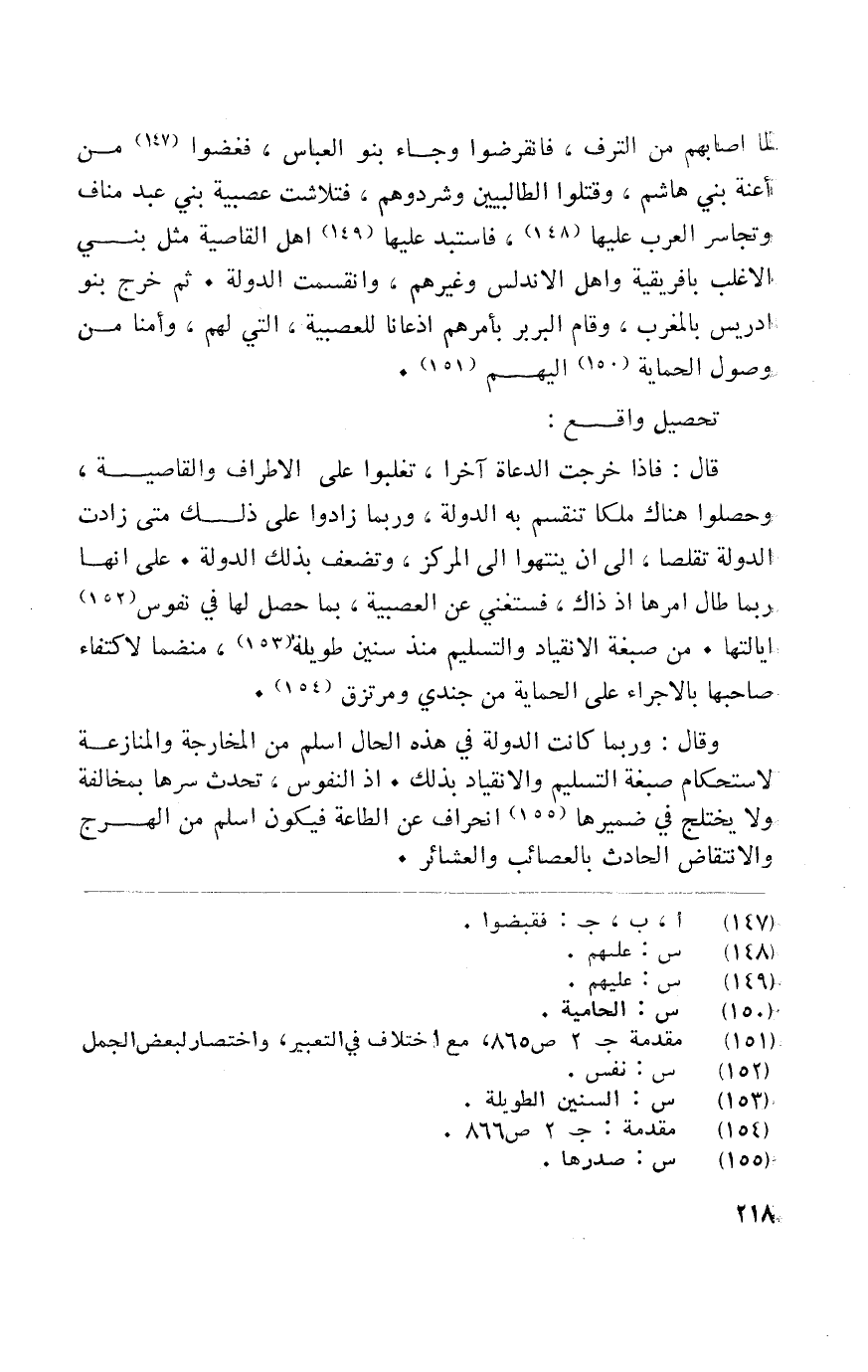 لما اصابهم من الترف فانقرضوا وَجَاء بَنو الْعَبَّاس فغضوا من اعنه بني هَاشم وقتلوه الطالبين وشردوهم فنلاشت عصبية بني عبد منَاف وتجاسر الْعَرَب عَلَيْهَا فاستبد عَلَيْهَا أهل القاصية مثل بني الاغلب بأفريقية واهل الأندلس وَغَيرهم وانقسمت الدولة ثمَّ خرج بَنو ادريس بالمغرب وَقَامَ البربر بأمرهم اذغانا للعصبية الَّتِي لَهُم وامنا من وُصُول الحماية اليهم