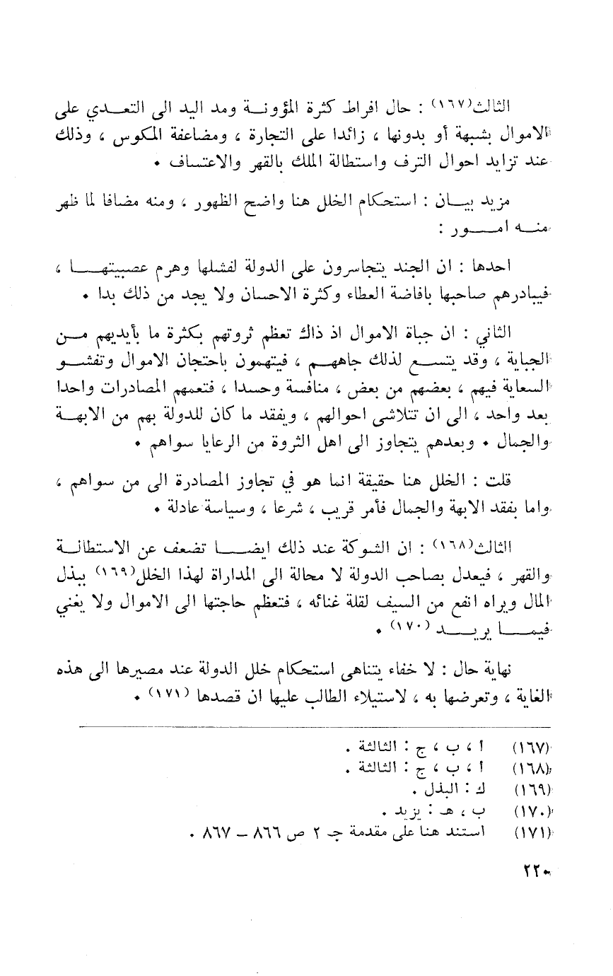 الثَّالِث أَن الشَّوْكَة عِنْد ذَلِك أَيْضا تضعف عَن الاستطالة والقهر فيعدل بِصَاحِب الدولة لَا محَالة إِلَى المداراة لهَذَا الْخلَل ببذل المَال وَيَرَاهُ نفع من السَّيْف لقلَّة غنائه فتعظم حَاجَتهَا إِلَى الْأَمْوَال وَلَا يُغني فِيمَا يُرِيد