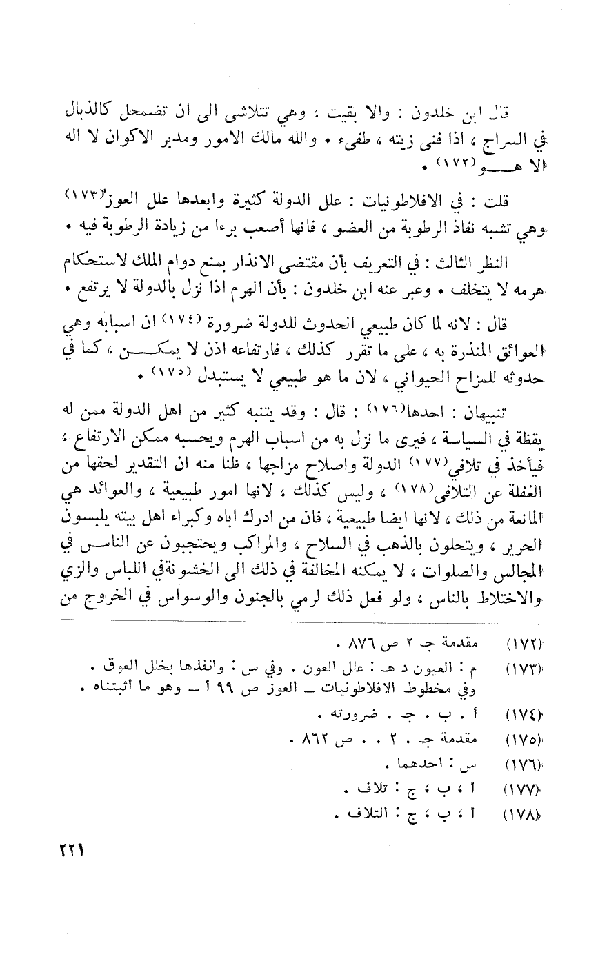 قلت فِي الافلاطونيات علل الدولة كَثِيرَة وأبعدها علل العوز وَهِي تشبه نَفاذ الرُّطُوبَة من الْعُضْو فَإِنَّهَا اصعب برءا من زِيَادَة الرُّطُوبَة فِيهِ