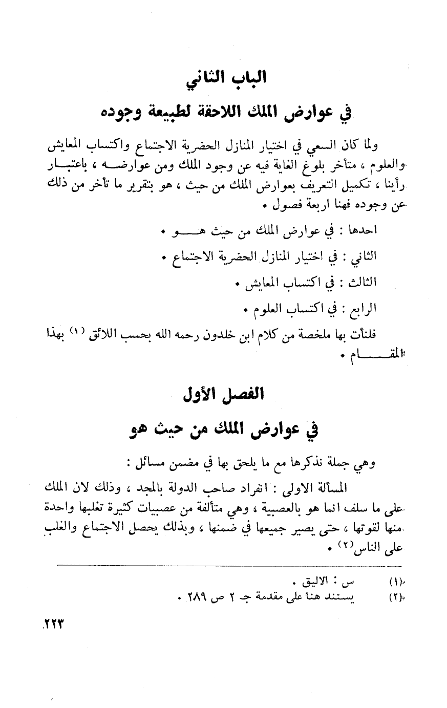 وَلما كَانَ السَّعْي فِي اخْتِيَار الْمنَازل الحضرية الِاجْتِمَاع واكتساب المعايش والعلوم مُتَأَخّر بُلُوغ الْغَايَة فِيهِ من وجود الْملك وَمن عوارضه بِاعْتِبَار رَأينَا تَكْمِيل التَّعْرِيف بعوارض الْملك من حَيْثُ هُوَ بتقرير مَا تَأَخّر من ذَلِك عَن وجوده فَهُنَا اربعة فُصُول