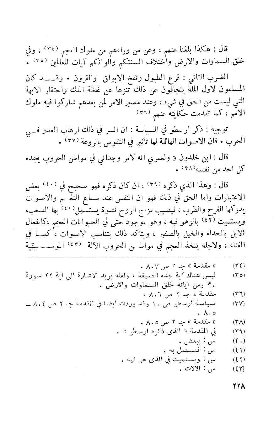 قَالَ وَهَذَا الَّذِي ذكره أَن كَانَ فَهُوَ صَحِيح فِي بعض الاعتبارات واما الْحق فِي ذَلِك فَهُوَ أَن النَّفس عِنْد سَماع النغم والاصوات يُدْرِكهَا الْفَرح والطرب فَيُصِيب مزاج الرّوح نشوة يستسهل بهَا الصعب ويستميت بالزهو فِيهِ وَهُوَ مَوْجُود حَتَّى فِي الْحَيَوَانَات الْعَجم كانفعال الابل بالحداء وَالْخَيْل بالصفير ويتأكد ذَلِك بتناسب الاصوات كَمَا فِي الْغناء ولاجله يتَّخذ الْعَجم فِي مَوَاطِن الحروب الالة الموسيقية