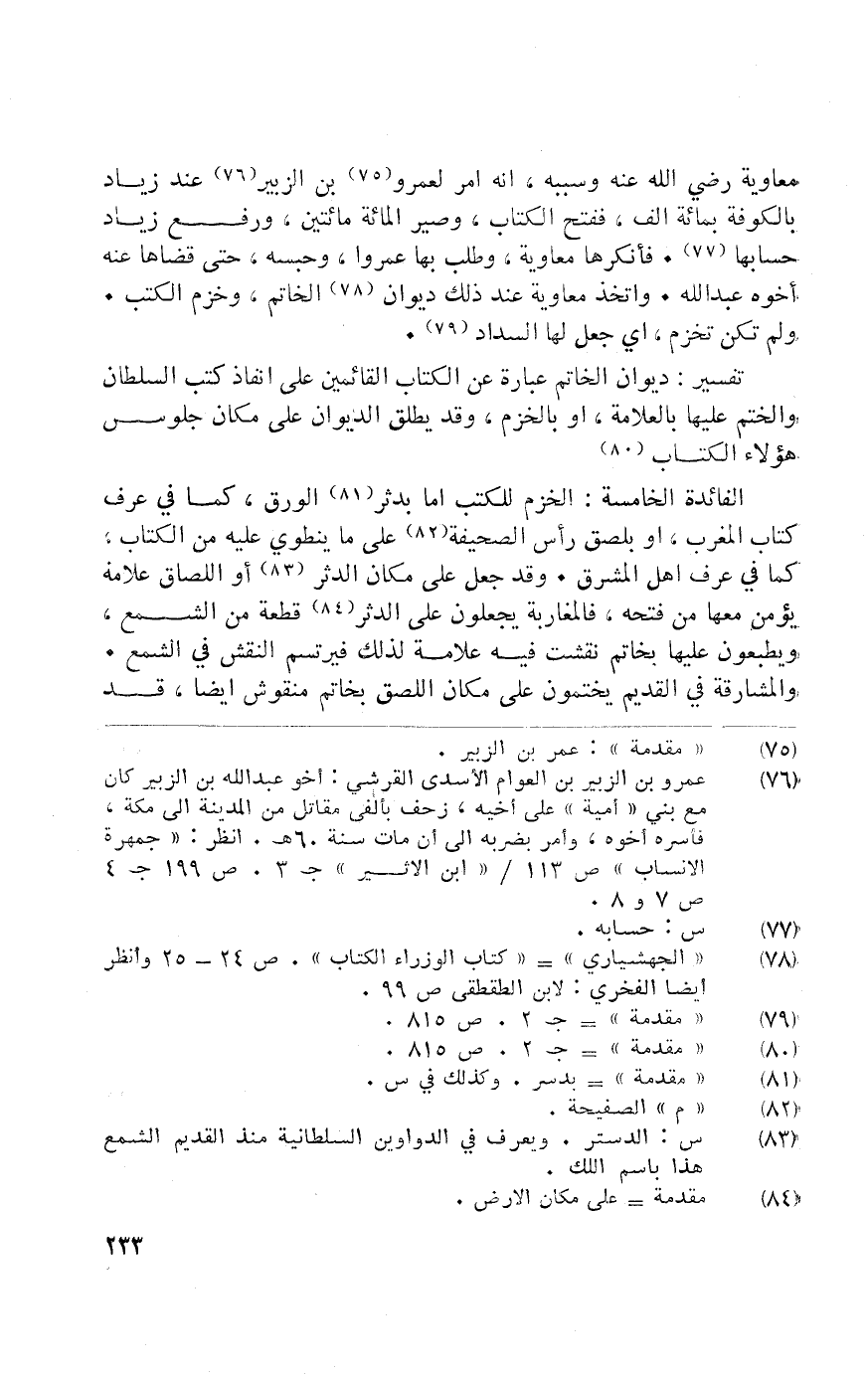مُعَاوِيَة رَضِي الله عَنهُ وَسَببه انه أَمر لعَمْرو بن الزبير عِنْد زِيَاد بِالْكُوفَةِ بِمِائَة ألف فَفتح الْكتاب وصير الْمِائَة مِائَتَيْنِ وَرفع زِيَاد حِسَابهَا فأنكرها مُعَاوِيَة وَطلب بهَا عمروا وحبسه حَتَّى قضايا عَنهُ اخوه عبد الله وَاتخذ مُعَاوِيَة عِنْد ذَلِك ديوَان الْخَاتم وخزم الْكتب وَلم تكن تخزم أَي جعل لَهَا السداد