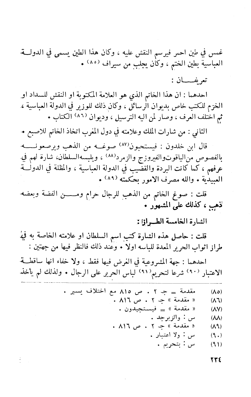 قَالَ ابْن خلدون فيستحبون صوغه من الذَّهَب ويرصعونه بالفصوص من الْيَاقُوت والفيروزج والزمرد ويلبسه السُّلْطَان شارة لَهُم فِي عرفهم كَمَا كَانَت الْبردَة والقضيب فِي الدولة العباسية والمظلمة فِي الدولة العبيدية وَالله مصرف الْأُمُور بِحِكْمَتِهِ