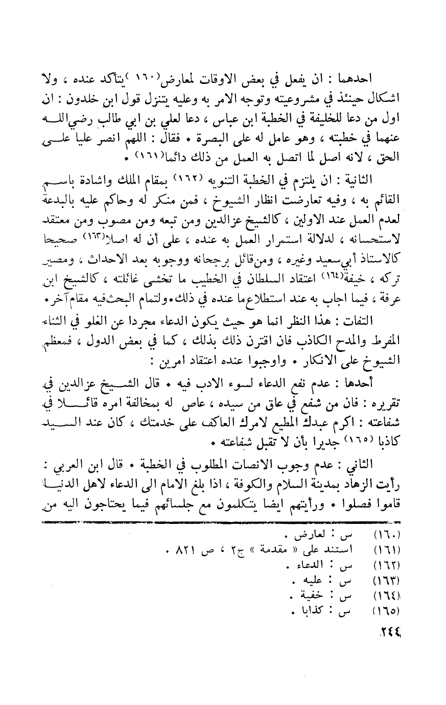 أَحدهمَا أَن يفعل فِي بعض الاوقات لمعارض يتَأَكَّد عِنْده وَلَا اشكال حِينَئِذٍ فِي مشروعيته وَتوجه الْأَمر بِهِ وَعَلِيهِ يتنزل قَول ابْن خلدون أَن أول من دَعَا للخليفة فِي الْخطْبَة ابْن عَبَّاس دَعَا لعَلي بن أبي طَالب رَضِي الله عَنْهُمَا فِي حطبته وَهُوَ عَامل لَهُ على الْبَصْرَة فَقَالَ اللَّهُمَّ انصر عليا على الْحق لانه اصل لما اتَّصل بِهِ الْعَمَل من ذَلِك دَائِما