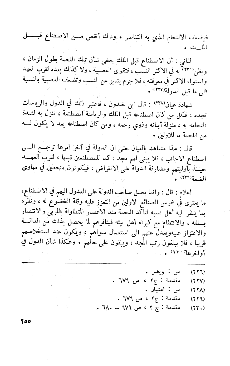 اعلام قَالَ وانما يحمل صَاحب الدولة على إِلَيْهِم فِي الاصطناع مَا يعترى فِي نفوس الصَّنَائِع الْأَوَّلين من التعزز عَلَيْهِ وَقلة الخضوع لَهُ وَنَظره بِمَا ينظر إِلَيْهِ أهل نِسْبَة لتأكد اللحمة مُنْذُ الاعصار المتطاولة بالمربى والانتصار بسلفه والانتظام مَعَ كبراء أهل بَيته فينافرهم لما يحصل بذلك من الدَّالَّة والاعتزاز عَلَيْهِ ويعدل عَنْهُم إِلَى اسْتِعْمَال سواهُم وَيكون عِنْد اتخلاصهم قَرِيبا فَلَا يبلغون رتب الْمجد ويبقون على حَالهم وَهَكَذَا شَأْن الدول فِي أواخرها
