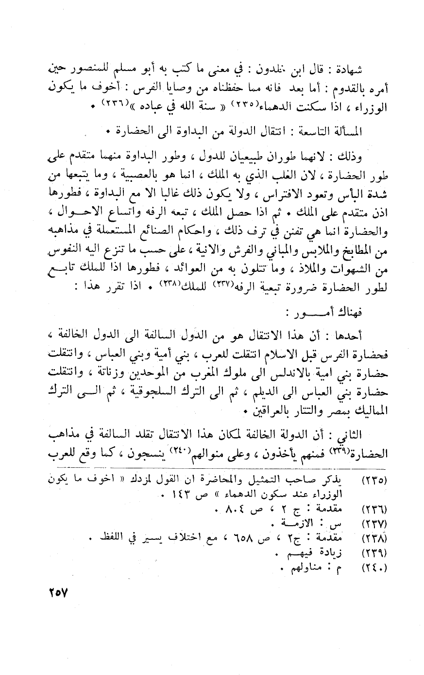 أَحدهَا أَن هَذَا الِانْتِقَال هُوَ من الدول السالفة إِلَى الدول الخالفة فحضارة الْفرس قلا الْإِسْلَام انْتَقَلت للْعَرَب بني أُميَّة وَبني الْعَبَّاس وانتقلت حضارة بني أُميَّة بالأندلس إِلَى مُلُوك الْمغرب من الْمُوَحِّدين وزناتة وانتفلت حضارة بني الْعَبَّاس إِلَى الديلم ثمَّ إِلَى التّرْك السلجوقية ثمَّ إِلَى التّرْك المماليك بِمصْر والتتار بالعراقين