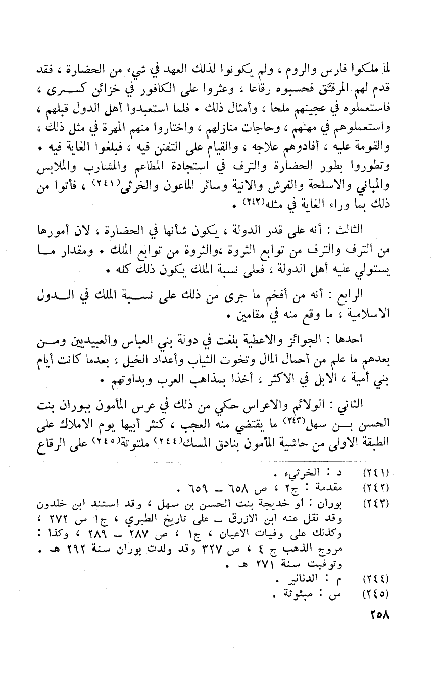 لما ملكوا فَارس وَالروم وَلم يَكُونُوا لذَلِك الْعَهْد فِي شَيْء من الحضارة فقد قدم لَهُم الْمرْفق فحسبوه رِقَاعًا وعثروا على الكافور فِي خَزَائِن كسْرَى فاستعملوه فِي عجينهم ملحا وامثال ذَلِك فَلَمَّا استعبدوا اهل الدول قبلهم واستعلموهم فِي مهنهم وحاجات مَنَازِلهمْ واختاروا مِنْهُم المهرة فِي مثل ذَلِك والقومة عَلَيْهِ افادوفم علاجه وَالْقِيَام على التفنن فِيهِ فبلغوا الْغَايَة فِيهِ وتطوروا بطور الحضارة والترف فِي استجادة المطاعم والمشارب والملابس والمباني والأسلحة والفرش والانية وَسَائِر الماعون والخرثى فَأتوا من ذَلِك بِمَا وَرَاء الْغَايَة فِي مثله