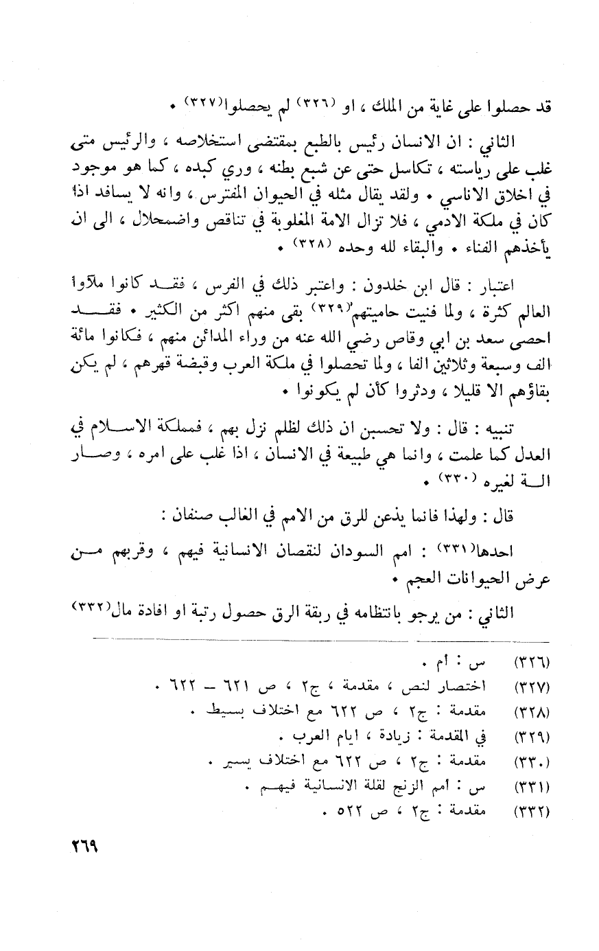 الثَّانِي أَن الانسان رَئِيس بالطبع بِمُقْتَضى استخلاصه والرئيس غلب على رياسته تكاسل حَتَّى عَن شبع بَطْنه وري كبده كَمَا هُوَ مَوْجُود فِي اخلاق الاناسي وَلَقَد يُقَال مثله فِي الْحَيَوَان المفترس وانه لَا يسافد إِذا كَانَ فِي ملكه الادمي فَلَا تزَال الْأمة المغلوبة فِي تناقص واصمحلال إِلَى أَن يَأْخُذهُمْ الفناء والبقاء لله وَحده