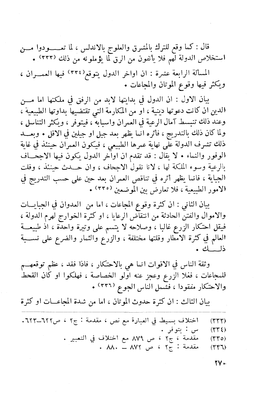 الْمَسْأَلَة الرَّابِعَة عشرَة أَن اواخر الدول يتَوَقَّع فِيهَا الْعمرَان وَيكثر فِيهَا وُقُوع الموتان والمجاعات