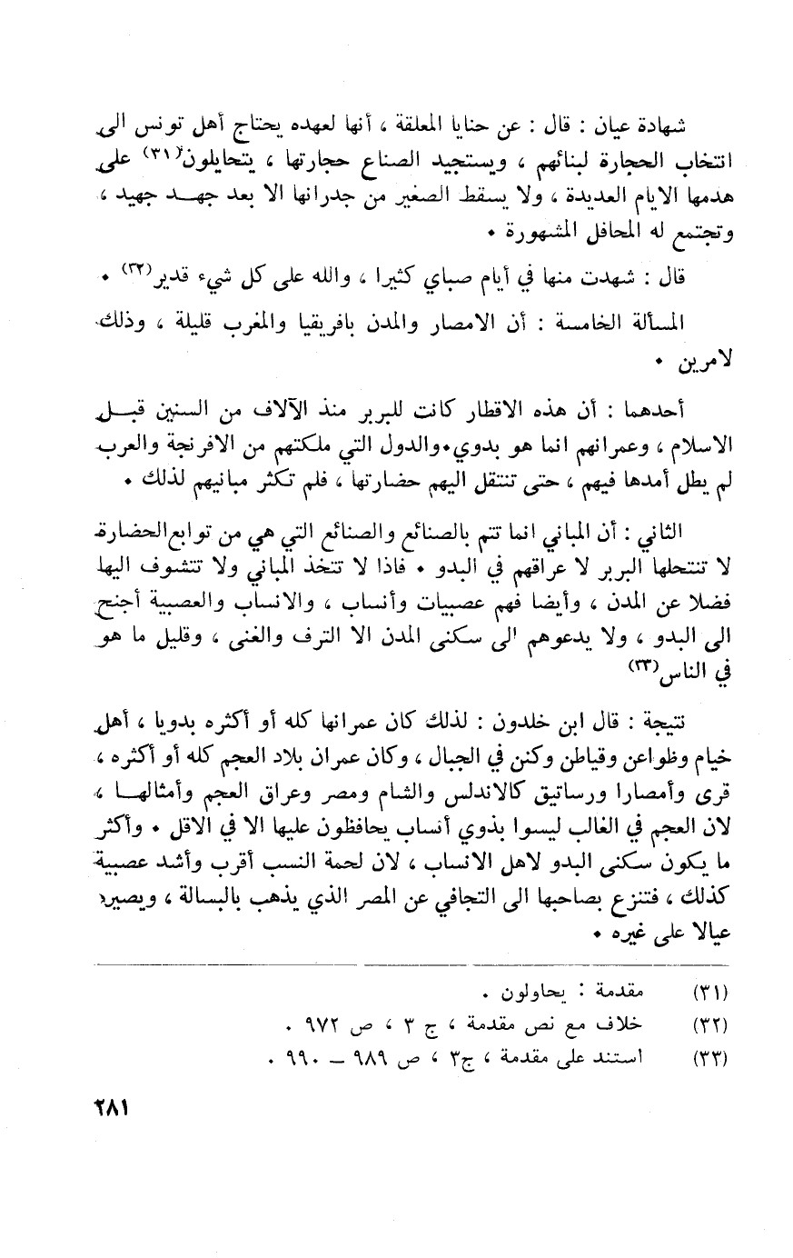 الثَّانِي أَن المباني إِنَّمَا تتمّ بالصنائع والصنائع الَّتِي هِيَ من تَوَابِع الحضارة لَا تنتحلها البربر لَا عراقهم فِي البدو فَإِذا لَا تتَّخذ المباني وَلَا تتشوف اليها فضلا عَن المدن وَأَيْضًا فهم عصبيات وانساب والأنساب والعصبية اجنح إِلَى البدو وَلَا يَدعُوهُم إِلَى سُكْنى المدن إِلَّا الترف والغنى وَقَلِيل مَا هُوَ فِي النَّاس