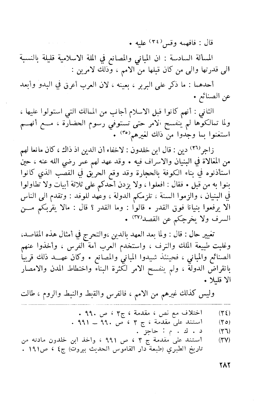 زاجر دين قَالَ ابْن خلدون لاخفاء أَن الدّين إِذْ ذَاك كَانَ مَانِعا لَهُم من المغلاة فِي الْبُنيان والاسراف فِيهِ وَفد عهد لَهُم عمر رَضِي الله عَنهُ حِين استأذنوه فِي بِنَاء الْكُوفَة بِالْحِجَارَةِ وَقد وَقع الْحَرِيق فِي الْقصب الَّذِي كَانُوا بنوا بِهِ من قبل فَقَالَ افعلوا وَلَا يزدن احدكم على ثَلَاثَة ابيات وَلَا تطاولوا فِي الْبُنيان والزموا السّنة تلزمكم الدولة وعهد للوفد وَتقدم إِلَى النَّاس إِلَّا يرفعوا بنيانا فَوق الْقدر قَالُوا الْقدر مَالا يقربكم من السَّرف وَلَا يخرجكم عَن الْقَصْد