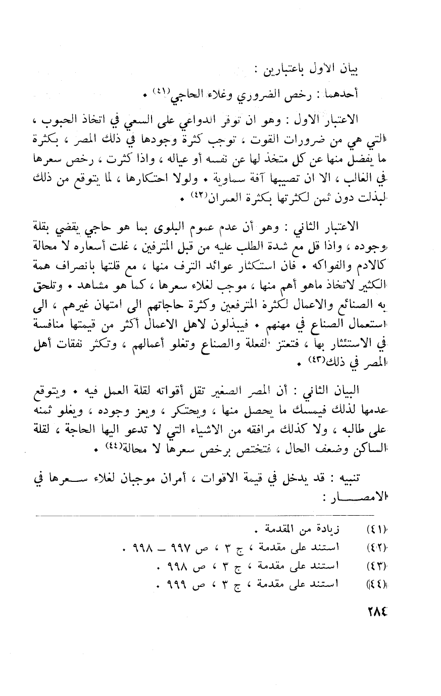 الِاعْتِبَار الأول وَهُوَ أَن توفر الدَّوَاعِي على السَّعْي فِي اتِّخَاذ الْحُبُوب الَّتِي هِيَ من ضرورات الْقُوت توجب كَثْرَة وجودهَا فِي ذَلِك الْمصر بِكَثْرَة مَا يفضل مِنْهَا عَن كل متخذ لَهَا عَن نَفسه أَو عِيَاله وَإِذا كثرت رخص سعرها فِي الْغَالِب إِلَّا أَن تصيبها افة سَمَاوِيَّة وَلَوْلَا احتكارها لما يتَوَقَّع من ذَلِك لبذلت دون لكثرتاه بِكَثْرَة الْعمرَان