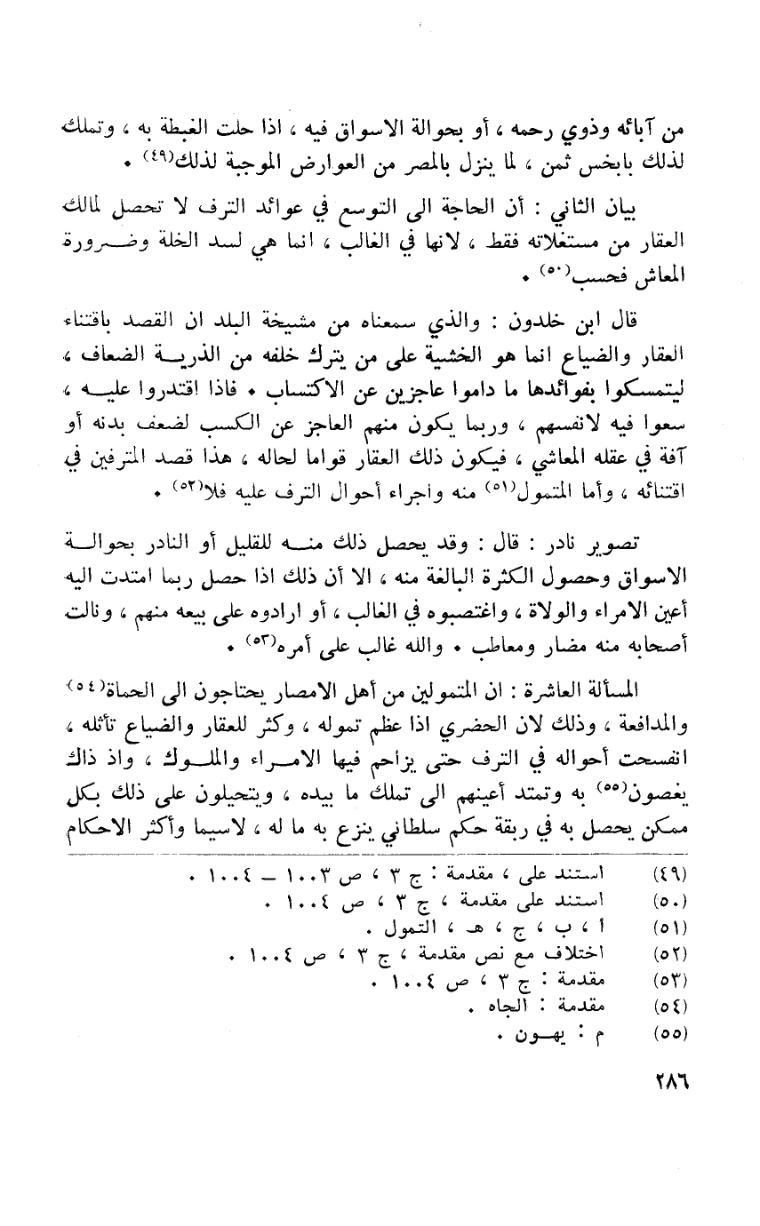قَالَ ابْن خلدون وَالَّذِي سمعناه من مشيخة الْبَلَد أَن الْقَصْد باقتناء الْعقار والضياع إِنَّمَا هُوَ الخشية على من يتْرك خَلفه من الذُّرِّيَّة الضِّعَاف ليتمسكوا بفوائدها مَا داموا عاجزين عَن الِاكْتِسَاب فَإِذا اقتدروا عَلَيْهِ سمعُوا فِيهِ لانفسهم وَرُبمَا يكون مِنْهُم الْعَاجِز عَن الْكسْب لضعف بدنه أَو آفَة فِي عقله المعاشي فَيكون ذَلِك الْعقار قواما لحاله هَذَا قصد المترفين فِي افتنائه واما المتمول مِنْهُ اجراء احوال الترف عَلَيْهِ فَلَا