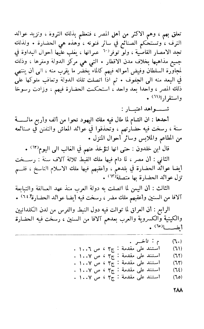 تعلق بهم وهم الْأَكْثَر من أهل الْمصر فتعظم بذلك الثروة وتزيد عوائد الترف وتستحكم الصَّنَائِع فِي سَائِر فنونه وَهَذِه هِيَ الحضارة وَلذَلِك تَجِد الامصار القاصية وَلَو توفر عمرانها يغلب عَلَيْهِ احوال البداوة فِي جَمِيع مذاهبها بِخِلَاف مدن الاقطار الَّتِي هِيَ مَرْكَز الدولة ومقرها وَذَلِكَ لمجاورة السُّلْطَان وفيض امواله فيهم كَالْمَاءِ يخضر مَا يقرب مِنْهُ إِلَى أَن يَنْتَهِي فِي الْبعد مِنْهُ إِلَى الجفوف ثمَّ إِذا اتَّصَلت تِلْكَ الدولة وتعاقب مُلُوكهَا على ذَلِك الْمصر وَاحِدًا بعد وَاحِد استحكمت الحضارة فيهم وزادت رسوخا واستقرارا