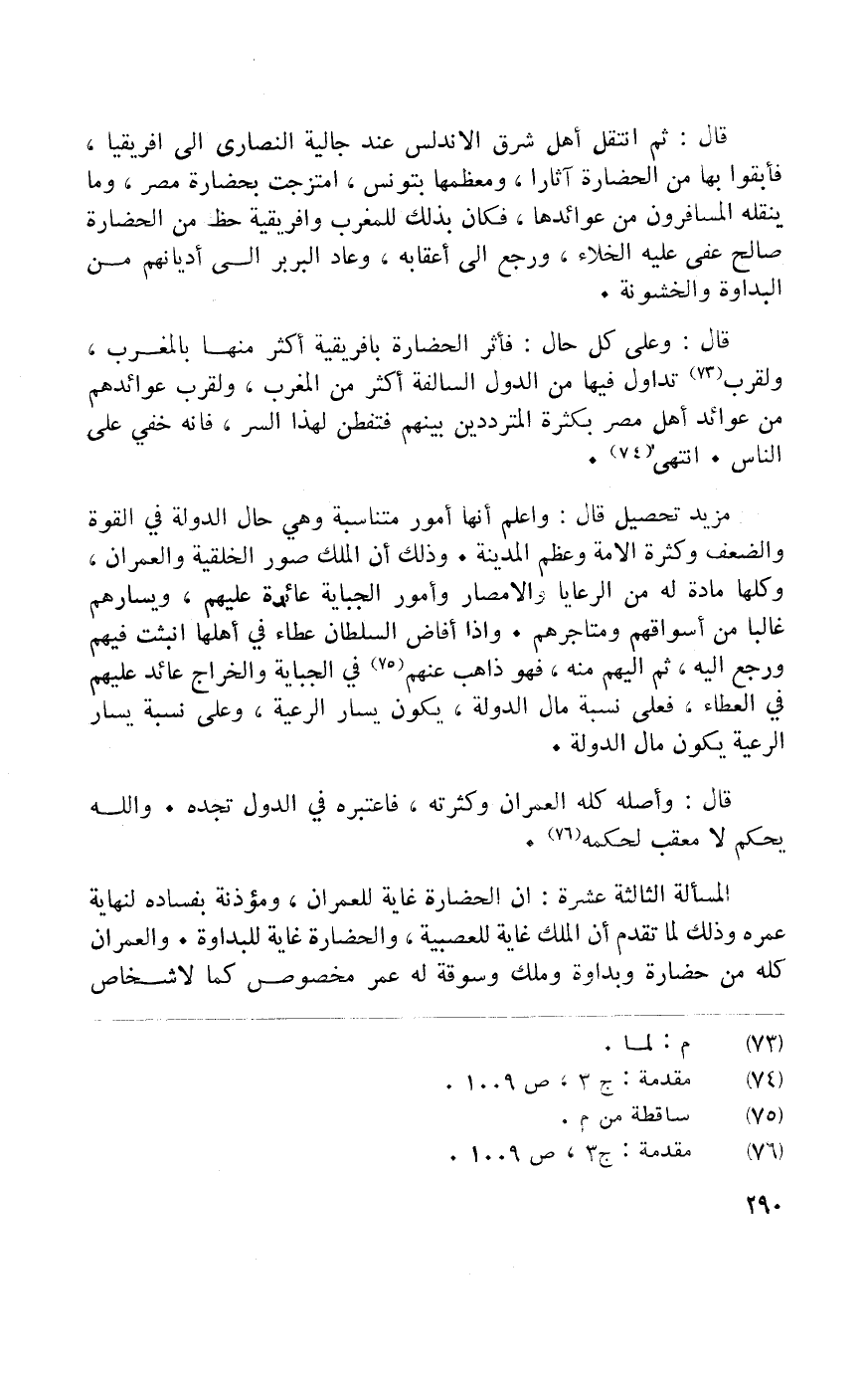 قَالَ وعَلى كل حَال فأثر الحضارة بأفريقية اكثر مِنْهَا بالمغرب ولقرب تداول فِيهَا من الدول السالفة اكثر من الْمغرب ولقرب عوائدهم من عوائد أهل مصر بِكَثْرَة المترددين بَينهم فتفظن لهَذَا السِّرّ فانه خَفِي على النَّاس انْتهى