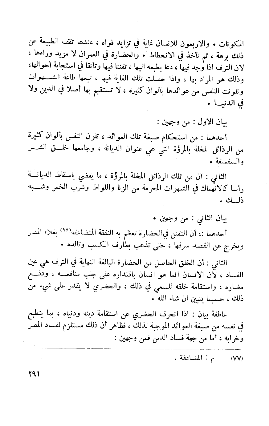 عاطفة بَيَان إِذا انحرف الحضري عَن استقامة دينة ودنياه بِمَا ينطبع فِي نَفسه من صبغة العوائد الْمُوجبَة لذَلِك فَظَاهر أَن ذَلِك مستلزما لفساد الْمصر وخرابه إِمَّا من جِهَة فَسَاد الدّين فَمن وَجْهَيْن
