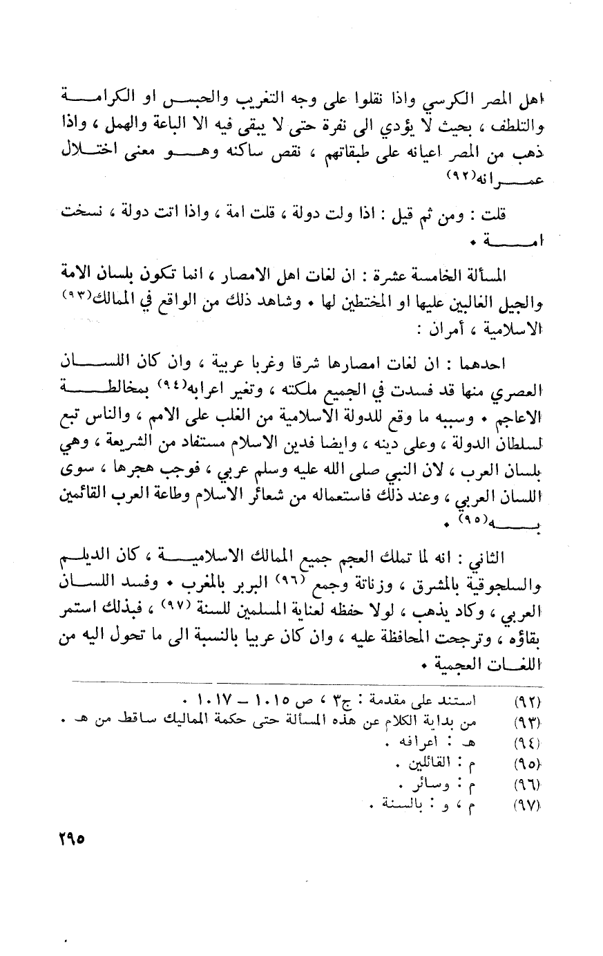 أَحدهمَا أَن لُغَات أهل الامصار شرقا وغربا عَرَبِيَّة وان كَانَ اللِّسَان العصري مِنْهَا قد فَسدتْ فِي الْجَمِيع ملكته وتغيير اعرابه بمخالطة الاعاجم وَسَببه مَا وَقع للدولة الاسلامية من الغلب على الامم وَالنَّاس تبع لسلطان الدولة وعَلى دينه وَأَيْضًا فدين الْإِسْلَام مُسْتَفَاد من الشَّرِيعَة وَهِي بِلِسَان الْعَرَب لَان النَّبِي ص صلى الله عَلَيْهِ وَسلم عَرَبِيّ فَوَجَبَ هجرها سوى اللِّسَان الْعَرَبِيّ وَعند ذَلِك فاستعماله من شَعَائِر الْإِسْلَام وَطَاعَة الْعَرَب القائمين بِهِ