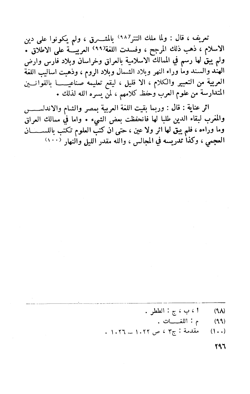 تَعْرِيف قَالَ وَلما ملك التتر بالمشرق وَلم يَكُونُوا على دين الْإِسْلَام ذهب ذَلِك الْمُرَجح وفسدت اللُّغَة الْعَرَبيَّة على الاطلاق وَلم يبْق لَهَا رسم فِي الممالك الاسلامية بالعراق وخراسان وبلاد فَارس وَارْضَ الْهِنْد والسند وَمَا وَرَاء النَّهر وبلاد الشمَال وبلاد الشمَال وبلاد الرّوم وَذَهَبت اساليب اللُّغَة الْعَرَبيَّة من التَّعْبِير وَالْكَلَام إِلَّا قَلِيل ليَقَع تَعْلِيمه صناعيا بالقوانين المتدارسة من عُلُوم الْعَرَب وَحفظ كَلَامهم لمن يسره الله لذَلِك