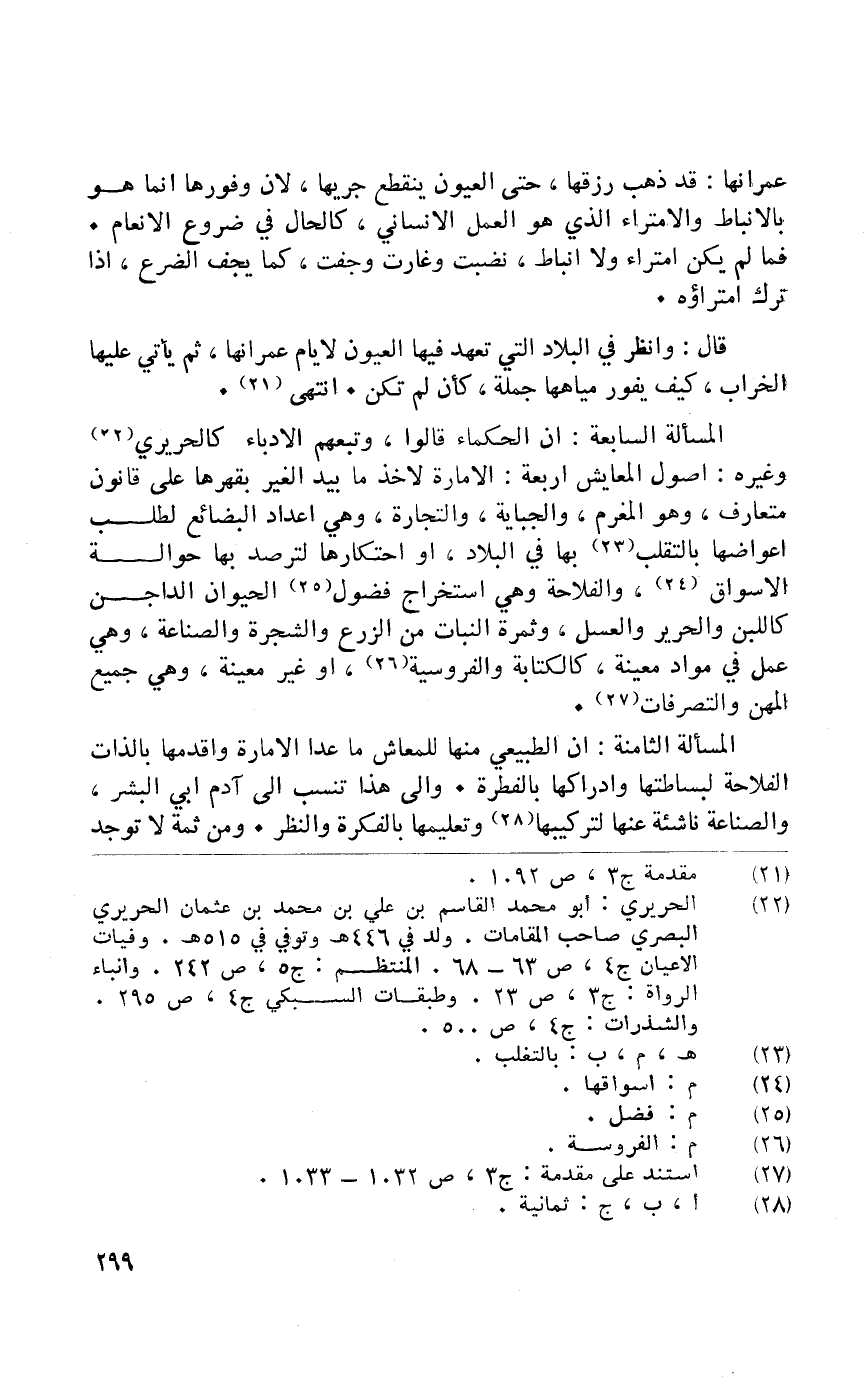 الْمَسْأَلَة السَّابِعَة أَن الْحُكَمَاء قَالُوا وتبعهم الادباء كالحريري وَغَيره اصول المعايش اربعة الامارة لاخذ مَا بيد الْغَيْر بقهرها على قانون مُتَعَارَف وَهُوَ المغرم والجباية وَالتِّجَارَة وَهِي اعداد البضائع لطلب اعواضها بالتقلب بهَا فِي الْبِلَاد أَو احتكارها لترصد بهَا حِوَالَة الاسواق والفلاحة وَهِي اسْتِخْرَاج فضول الْحَيَوَان الدَّاجِن كاللبن وَالْحَرِير وَالْعَسَل وَثَمَرَة النَّبَات من الزَّرْع ولشجرة والصناعة وَهِي عمل فِي مواد مُعينَة كالكتابة والفروسية أَو غير مُعينَة وَهِي جَمِيع المهن والتصرفات