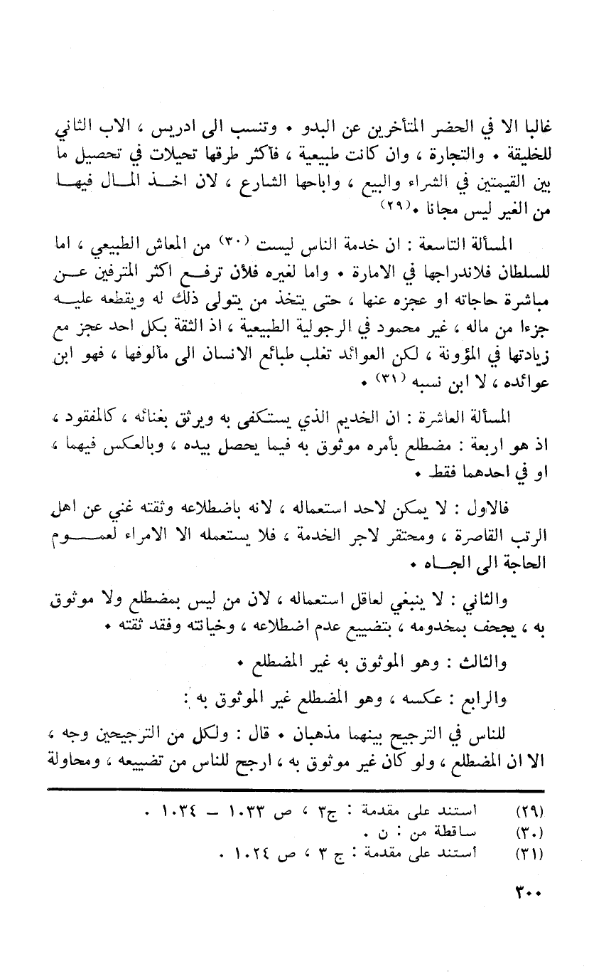 الْمَسْأَلَة التَّاسِعَة أَن خدمَة النَّاس لَيست من المعاش الطبيعي إِمَّا للسُّلْطَان فَلَا ندراجها فِي الامارة واما لغيره فَلِأَن ترفع اكثر المترفين عَن مُبَاشرَة حاجاته أَو عَجزه عَنْهَا حَتَّى يتَّخذ من يتَوَلَّى ذَلِك لَهُ ويقطعه عَلَيْهِ جُزْءا من مَاله غير مَحْمُود فِي الرجولية الطبيعية إِذا الثِّقَة بِكُل أحد عجز مَعَ زيادتها فِي المؤونة لَكِن العوائد تغلب طبائع الانسان إِلَى مالوفها فَهُوَ ابْن عوائدة لَا بن نِسْبَة