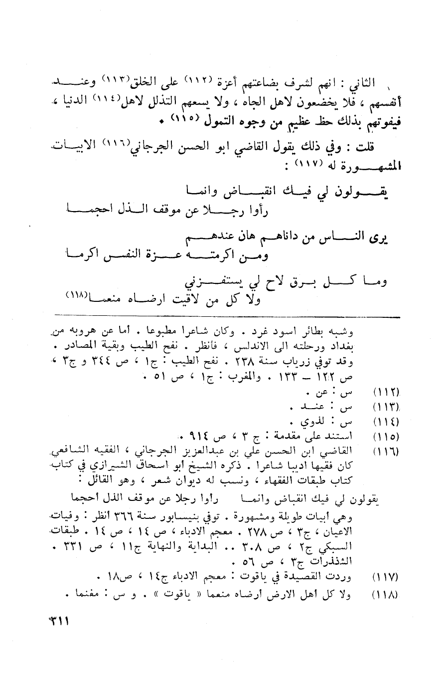 قلت وَفِي ذَلِك يَقُول القَاضِي أَبُو الْحسن الْجِرْجَانِيّ الأبيات الْمَشْهُور لَهُ