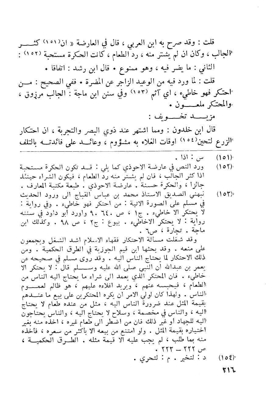 قَالَ ابْن خلدون وَمِمَّا اشْتهر عِنْد ذَوي الْبَصَر والتجربة أَن احتكار الزَّرْع لتحين اوقات الغلاء بِهِ مشؤوم وعائد على فَائِدَته بالتلف