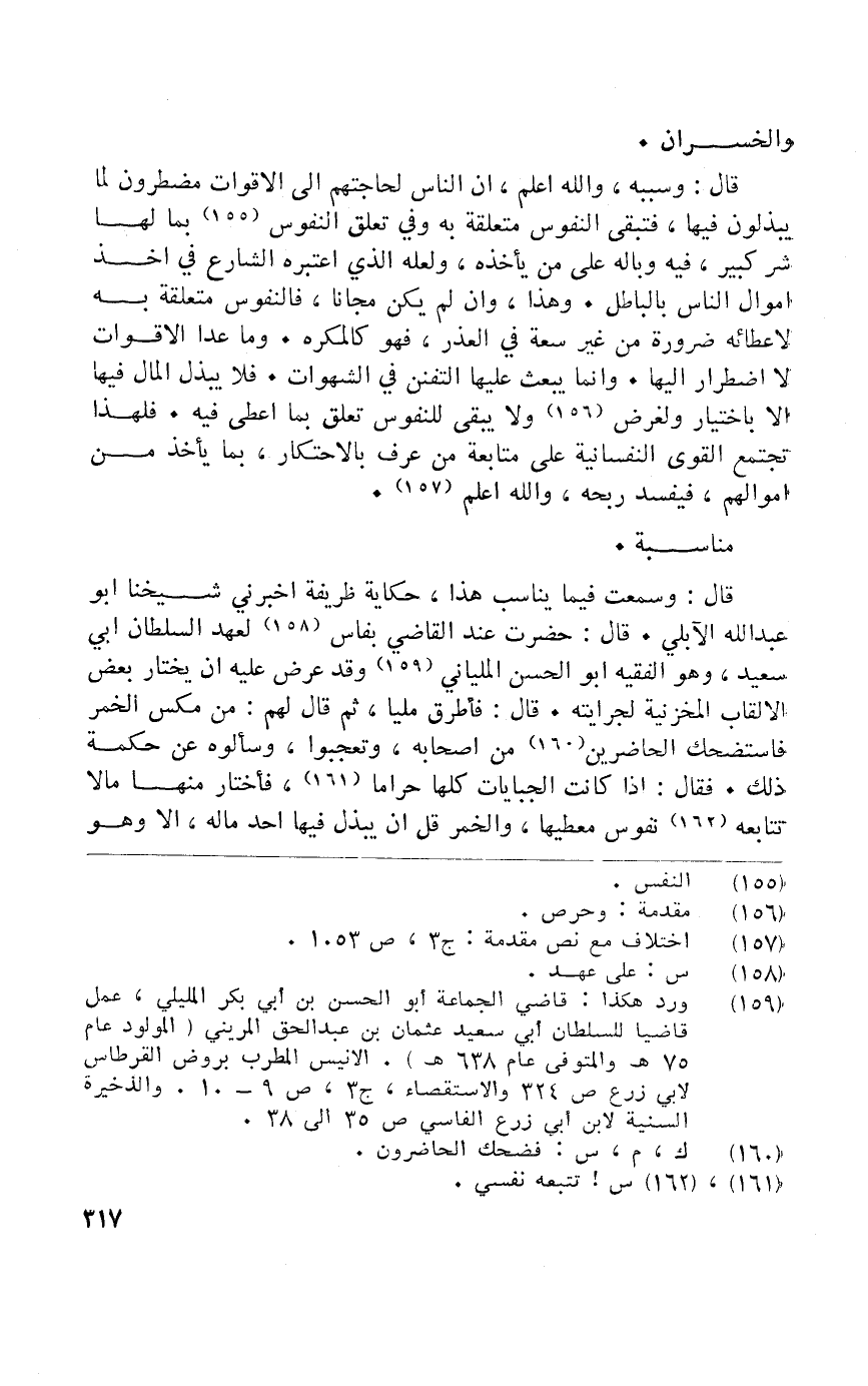 قَالَ وَسمعت فِيمَا يُنَاسب هَذَا حِكَايَة ظريفة اخبرني شَيخنَا أَبُو عبد الله الابلي قَالَ حضرت عِنْد القَاضِي بفاس لعهد السُّلْطَان أبي سعيد وَهُوَ الْفَقِيه أَبُو الْحسن الملياني وَقد عرض عَلَيْهِ أَن يخْتَار بعض الألقاب المخزنية لجرايته قَالَ فاطرق مَلِيًّا ثمَّ قَالَ لَهُم من مكس الْخمر فاستضحك الْحَاضِرين من اصحابه وتعجبوا وسألوه عَن حكمه ذَلِك فَقَالَ إِذا كَانَت الجبايات كلهَا حَرَامًا فأختار مِنْهَا مَالا تتابعه نفوس معطيها وَالْخمر قل أَن يبْذل فِيهَا أحد مَاله إِلَّا وَهُوَ