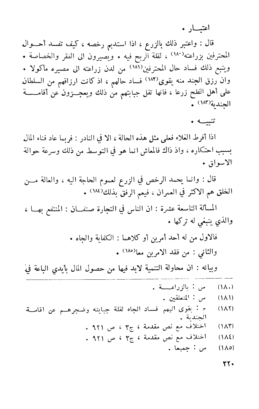 قَالَ وَاعْتبر ذَلِك بالزرع إِذا استدبم رخصه كَيفَ تفْسد احوال المحترفين بزراعته لقلَّة الرِّبْح فِيهِ ويصيرون إِلَى الْفقر والخصاصة وَيتبع ذَلِك فَسَاد حَال المحترفين من لدن زراعته إِلَى مصيره مَاكُولَا وان رزق الْجند مِنْهُ يُقَوي فَسَاد حَالهم إِذْ كَانَت ارازاقهم من السُّلْطَان على أهل الفلح زرعا فَإِنَّهَا تقل جبابتهم من ذَلِك ويعجزون عَن اقامة الجندية