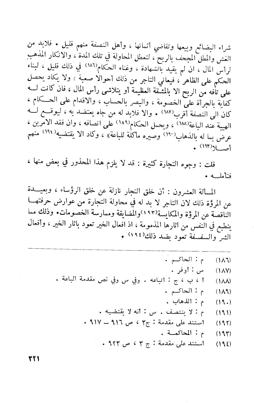 الْمَسْأَلَة الْعشْرُونَ أَن خلق التُّجَّار نازلة عَن خلق الرؤساء وبعيدة عَن المرؤة ذَلِك لَان التَّاجِر لَا بُد لَهُ فِي محاولة التِّجَارَة من عوارض حرفتها النَّاقِصَة عَن المرؤة والمكايسة والمضاعفة وممارسة الْخُصُومَات وَذَلِكَ مِمَّا ينطبع فِي النَّفس من اثارها المذمومة إِذْ افعال الْخَيْر تعود بآثار الْخَيْر وافعال الشَّرّ والسفسفة تعود بضد ذَلِك
