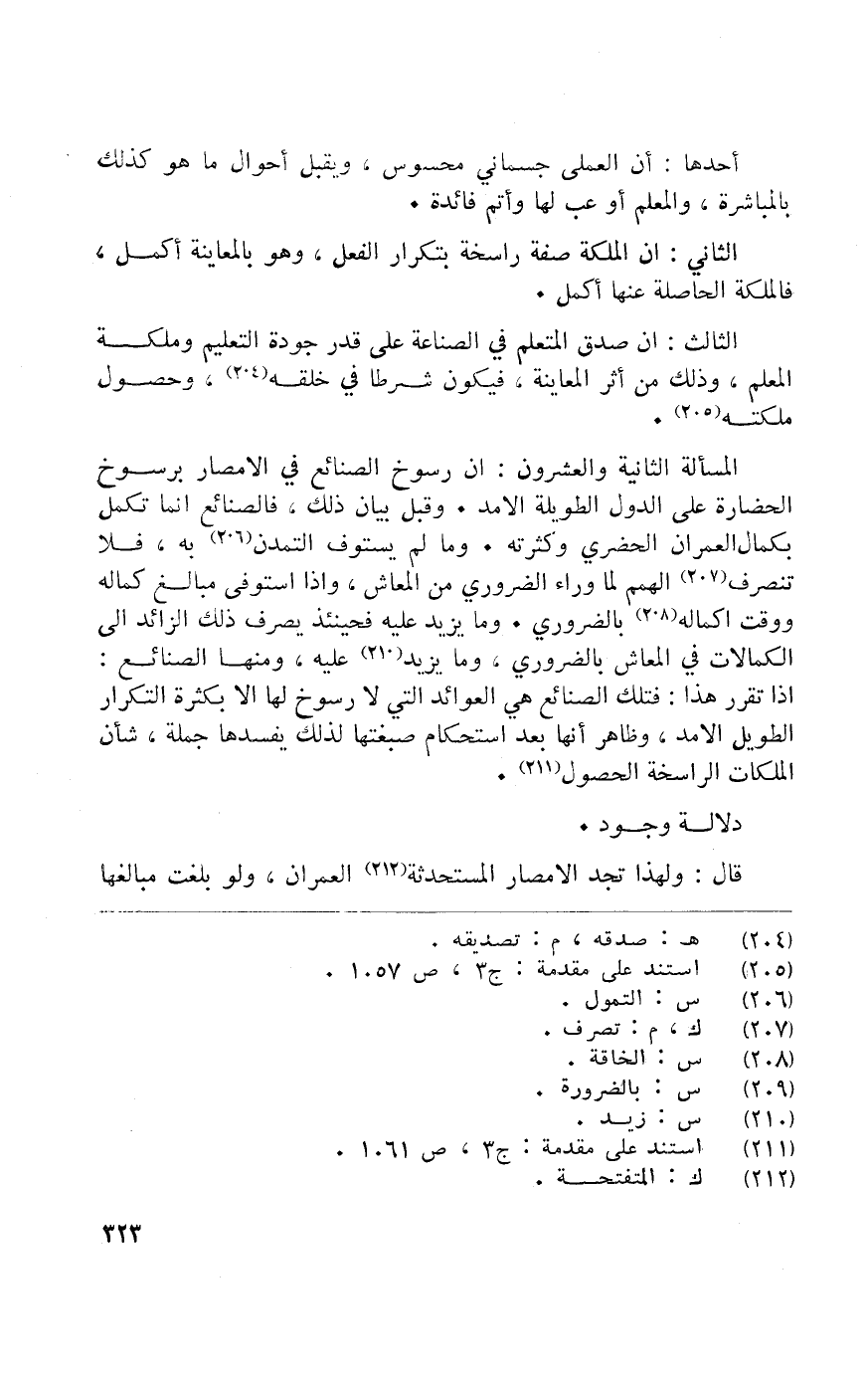 الْمَسْأَلَة الثَّانِيَة وَالْعشْرُونَ أَن رسوخ الصَّنَائِع فِي الامصار برسوخ الحضارة على الدول الطَّوِيلَة الامد وَقبل بَيَان ذَلِك فالصنائع إِنَّمَا تكمل بِكَمَال الْعمرَان الحضري وكثرته وَمَا لم يسْتَوْف التمدن بِهِ فَلَا تَنْصَرِف الهمم لما وَرَاء الضَّرُورِيّ وَمن المعاش وَإِذا استوفى مبالغ كَمَاله وَوقت اكماله بالضروري وَمَا يزِيد عَلَيْهِ فَحِينَئِذٍ يصرف ذَلِك الزَّائِد إِلَى الكمالات فِي المعاش بالضروري وَمَا يزِيد عَلَيْهِ وَمِنْهَا الصَّنَائِع
