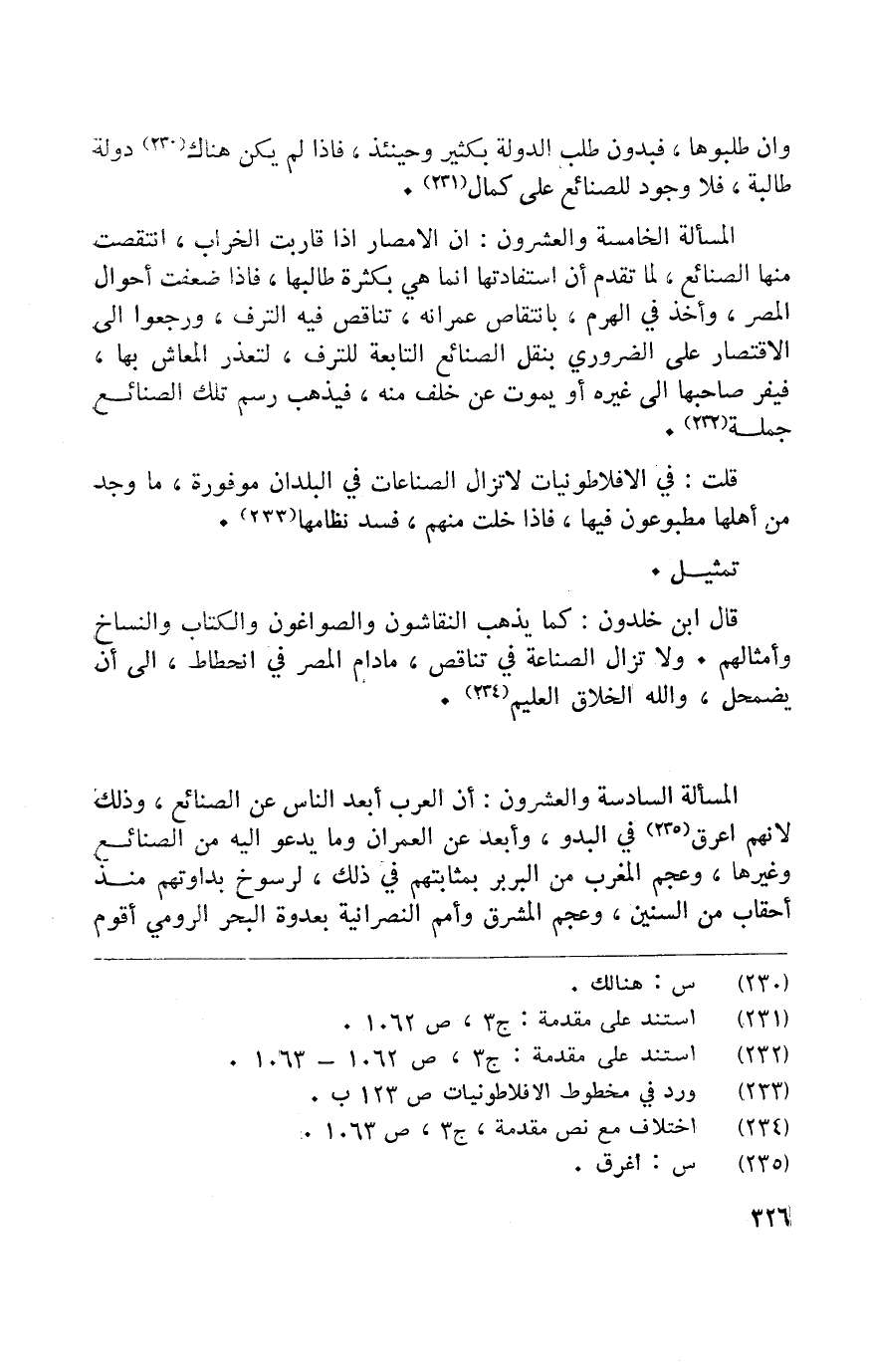 الْمَسْأَلَة السَّادِسَة وَالْعشْرُونَ أَن الْعَرَب ابعد النَّاس عَن لاصنائع وَذَلِكَ لأَنهم اعرق فِي البدو وابعد عَن الْعمرَان وَمَا يَدْعُو اليه من الصَّنَائِع وَغَيرهَا وعجم الْمغرب من البربر بمثابتهم فِي ذَلِك لرسوخ بداوتهم مُنْذُ احقاب من السنين وعجم الْمشرق وأمم النَّصْرَانِيَّة بعدوة الْبَحْر الرُّومِي أوم