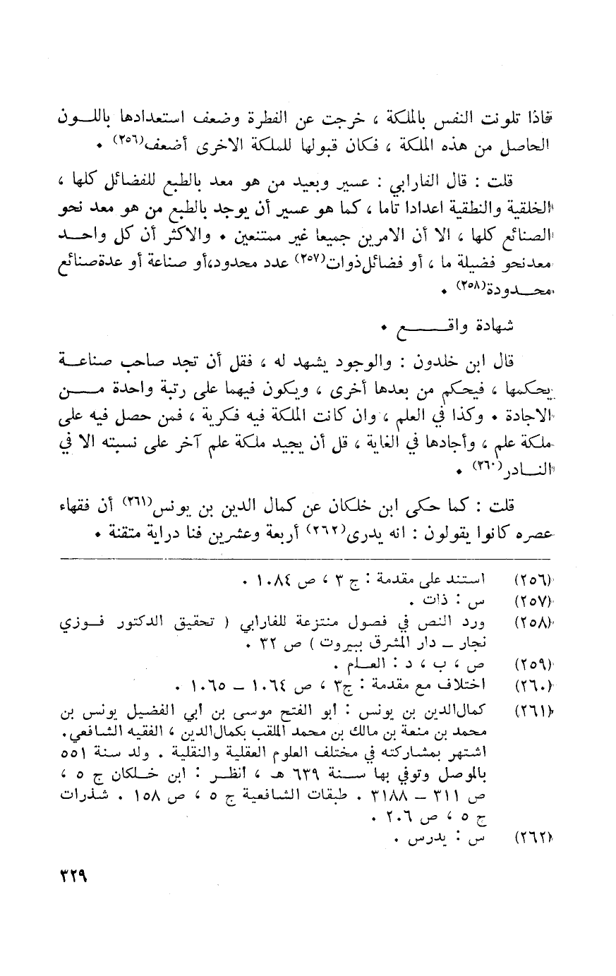 قَالَ ابْن خلدون والوجود يشْهد لَهُ فَقل أَن تَجِد صَاحب صناعَة يحكمها فَيحكم من بعْدهَا أُخْرَى وَيكون فيهمَا على رُتْبَة وَاحِدَة من الاجادة وَكَذَا فِي الْعلم وان كَانَت الملكة فِيهِ فكرية فَمن حصل فِيهِ على ملكة علم واجادها فِي الْغَايَة قل أَن يجيد ملكة علم آخر على نسبته إِلَّا فِي النَّادِر