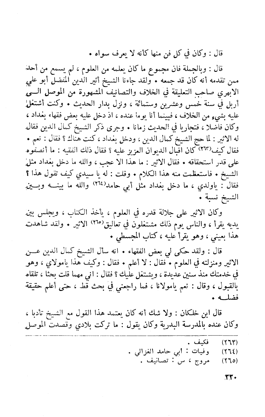 قَالَ وَبِالْجُمْلَةِ فَإِن مَجْمُوع مَا كَانَ يعمله من الْعُلُوم لم يسمع من أحد مِمَّن تقدمه انه كَانَ قد جمعه وَلَقَد جَاءَنَا الشَّيْخ اثير الدّين الْمفضل أَبُو عَليّ الابهري صَاحب التعليقة فِي الْخلاف والتصانيف الْمَشْهُورَة من الْموصل إِلَى اربل فِي سنة خمس وَعشْرين وسِتمِائَة وَنزل بدار الحَدِيث وَكنت اشْتغل عَلَيْهِ بِشَيْء من الْخلاف فَبَيْنَمَا انا يَوْمًا عِنْده إِذْ دخل عَلَيْهِ بعض فُقَهَاء بَغْدَاد وَكَانَ فَاضلا فتجاريا فِي الحَدِيث زَمَانا وَجرى ذكر الشَّيْخ كَمَال الدّين فَقَالَ لَهُ الاثير لما حج الشَّيْخ كَمَال الدّين وَدخل بَغْدَاد كنت هُنَاكَ فَقَالَ نعم فَقَالَ كَيفَ كَانَ اقبال الدِّيوَان الْعَزِيز عَلَيْهِ فَقَالَ ذَلِك الْفَقِيه مَا انصفوه على قدر اسْتِحْقَاقه فَقَالَ الاثير مَا هَذَا إِلَّا عجب وَالله مَا دخل بَغْدَاد مثل الشَّيْخ فاستعظمت مِنْهُ هَذَا الْكَلَام وَقلت لَهُ يَا سَيِّدي كيفتقول هَذَا فَقَالَ يَا وَلَدي مَا دخل بَغْدَاد مثل أبي حَامِد وَالله مَا بَينه وَبَين الشَّيْخ نِسْبَة