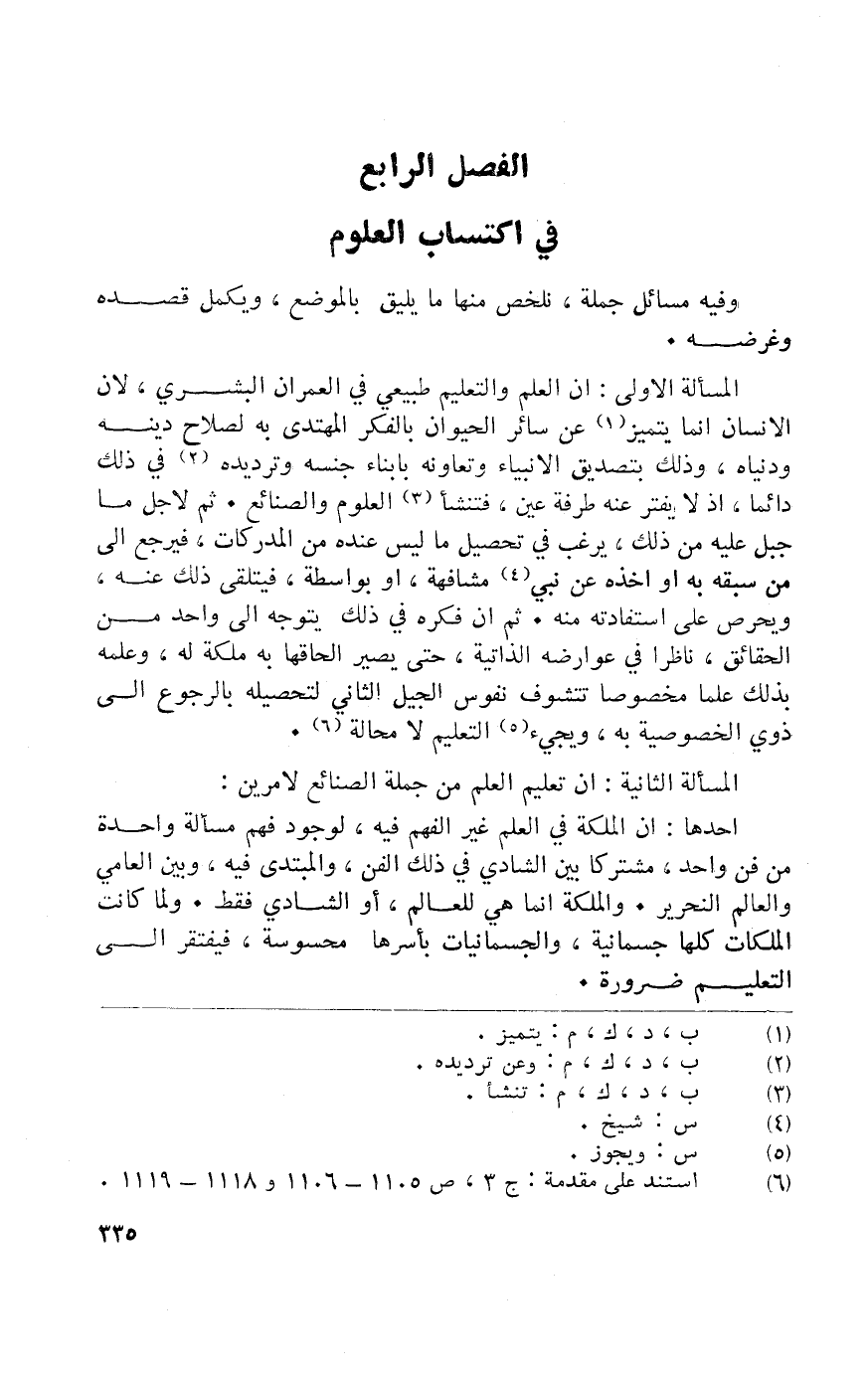 الْمَسْأَلَة الأولى أَن الْعلم والتعليم طبيعي فِي الْعمرَان البشري لَان الانسان إِنَّمَا يتَمَيَّز عَن سَائِر الْحَيَوَان بالفكر المهتدى بِهِ لصلاح دينه ودنياه وَذَلِكَ بِتَصْدِيق الْأَنْبِيَاء وتعاوه بابناء جنسه وترديده فِي ذَلِك دَائِما إِذْ لَا يفتر عَنهُ طرفَة عين فتنشأ الْعُلُوم والصنائع ثمَّ لأجل مَا جبل عَلَيْهِ من ذَلِك يرغب فِي تَحْصِيل مَا لَيْسَ عِنْده من المدركات فؤرجع إِلَى من سبقه بِهِ أَو اخذه عَن نَبِي مشافهة أَو بِوَاسِطَة فيتلقى ذَلِك عَنهُ ويحرص على استفادته مِنْهُ ثمَّ أَن فكره فِي ذَلِك يتَوَجَّه إِلَى وَاحِد من الْحَقَائِق نَاظرا فِي عوارضه الذاتية حَتَّى يصير الحاقها بِهِ ملكة لَهُ وَعلمه بذلك علما مَخْصُوصًا تتشوف نفوس الجيل الثَّانِي تَحْصِيله بِالرُّجُوعِ إِلَى ذَوي الخصوصية بِهِ وَيَجِيء التَّعْلِيم لَا محَالة