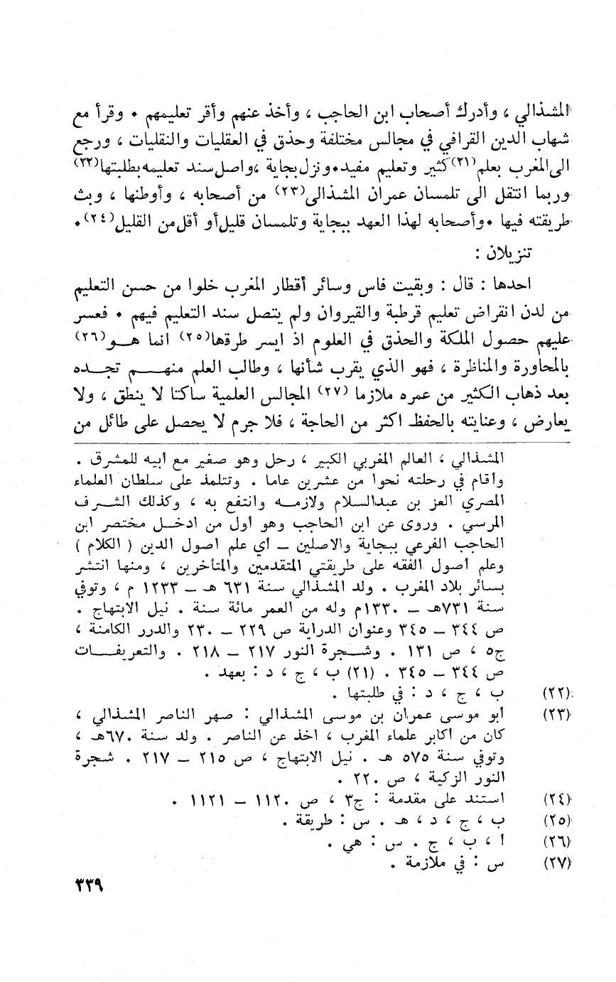 المشذالي وادرك أَصْحَاب ابْن الْحَاجِب واخذ عَنْهُم وَأقر تعليمهم وَقَرَأَ مَعَ شهَاب الدّين الْقَرَافِيّ فِي مجَالِس مُخْتَلفَة وحذق فِي العقليات والنقليات وَرجع إِلَى الْمغرب بِعلم كثير وَتَعْلِيم مُفِيد وَنزل بجاية وَاصل سَنَد تَعْلِيمه بطلبتها وَرُبمَا انْتقل إِلَى تلمسان عمرَان المشذالي من اصحابه واوطنها وَبث طَرِيقَته فِيهَا وصحابه لهَذَا الْعَهْد ببجاية وتلمسان قَلِيل أَو اقل من الْقَلِيل