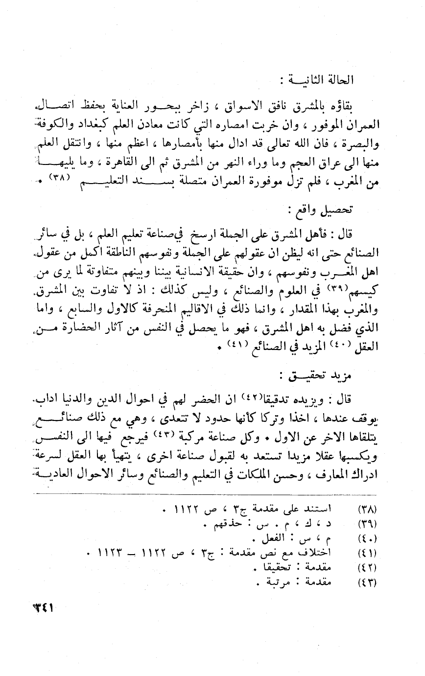 قَالَ فَأهل الْمشرق على الْجُمْلَة ارسخ فِي صناعَة تَعْلِيم الْعلم بل فِي سَائِر الصَّنَائِع حَتَّى انه ليظن أَن عُقُولهمْ على الْجُمْلَة ونفوسهم الناطقة اكمل من عقول أهل الْمغرب ونفوسهم وان حَقِيقَة الانسانية بَيْننَا وَبينهمْ تفاوتة لما يرى من كيسهم فِي الْعُلُوم والصنائع وَلَيْسَ كَذَلِك إِذْ لَا تفَاوت بَين الْمشرق وَالْمغْرب بِهَذَا الْمِقْدَار وانما ذَلِك فِي الاقاليم المنحرفة كالاول وَالسَّابِع واما الَّذِي فضل بِهِ أهل الْمشرق فَهُوَ مَا يحصل فِي النَّفس من آثَار الحضارة من الْعقل الْمَزِيد فِي الصَّنَائِع