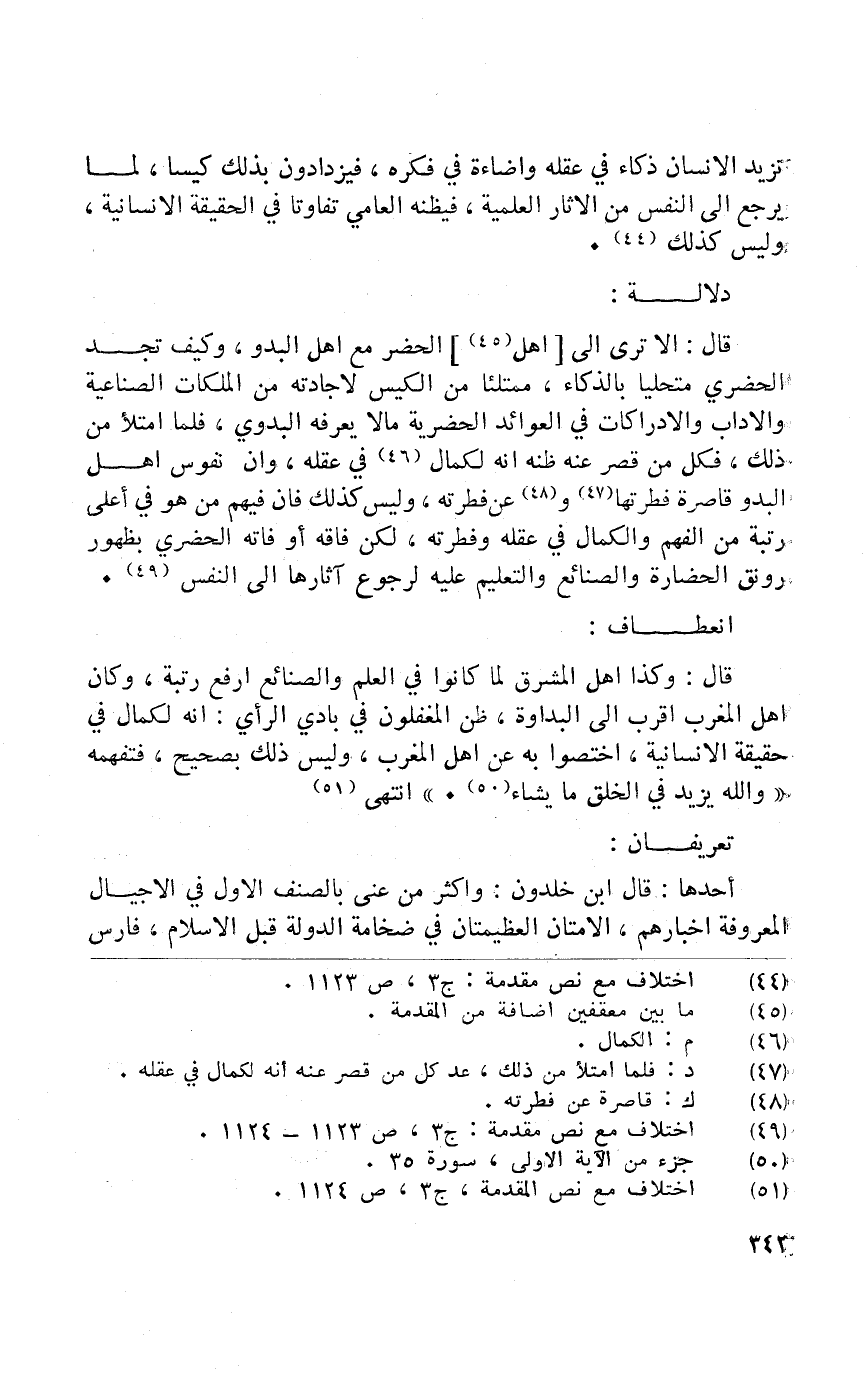قَالَ إِلَّا ترى إِلَى أهل الْحَضَر مَعَ أهل البدو وَكَيف تَجِد الحضري متحليا بالذكاء ممتلئا من الْكيس لاجادته من الملكات الصناعية والاداب والادراكات فِي العوائد الحضرية مَالا يعرفهُ البدوي فَلَمَّا امْتَلَأَ من ذَلِك فَكل من قصر عَنهُ ظَنّه انه لكَمَال فِي عقله وان نفوس أهل البدو قَاصِرَة فطرتها وَعَن فطرته وَلَيْسَ كذكل فَإِن فيهم من هُوَ فِي أَعلَى رُتْبَة من الْفَهم والكمال فِي عقله وفطرته لَكِن فاقه أَو فَاتَهُ الحضري بِظُهُور رونق الحضارة والصنائع والتعليم عَلَيْهِ لرجوع آثارها إِلَى النَّفس