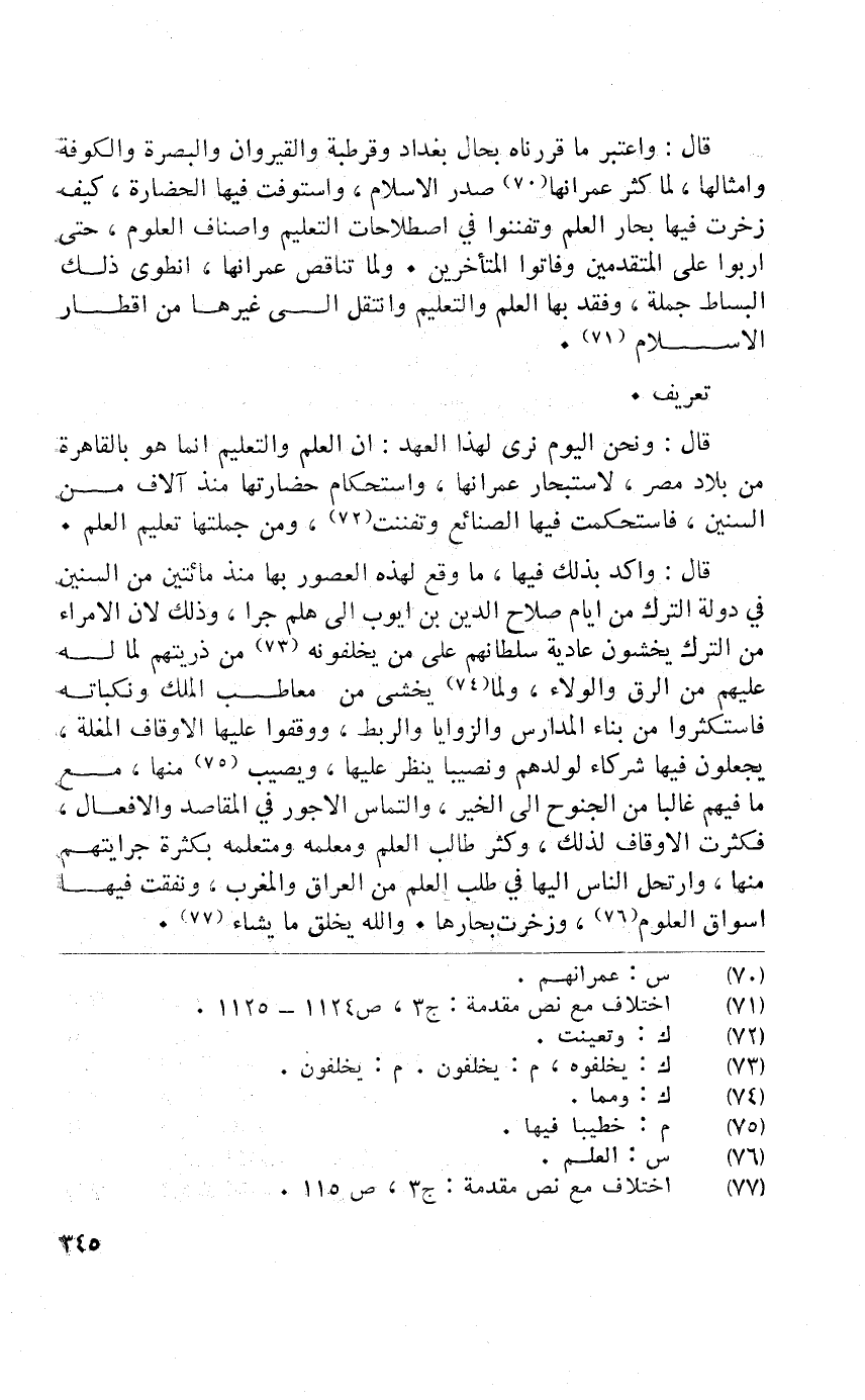 قَالَ وَنحن الْيَوْم نرى لهَذَا الْعَهْد أَن الْعلم والتعليم إِنَّمَا هـ بِالْقَاهِرَةِ من بِلَاد مصر لاستبحار عمرانها استحكام حضارتها مُنْذُ آلَاف من السنين فاستحكمت فِيهَا الصَّنَائِع وتفننت وَمن جُمْلَتهَا تعليمالعلم