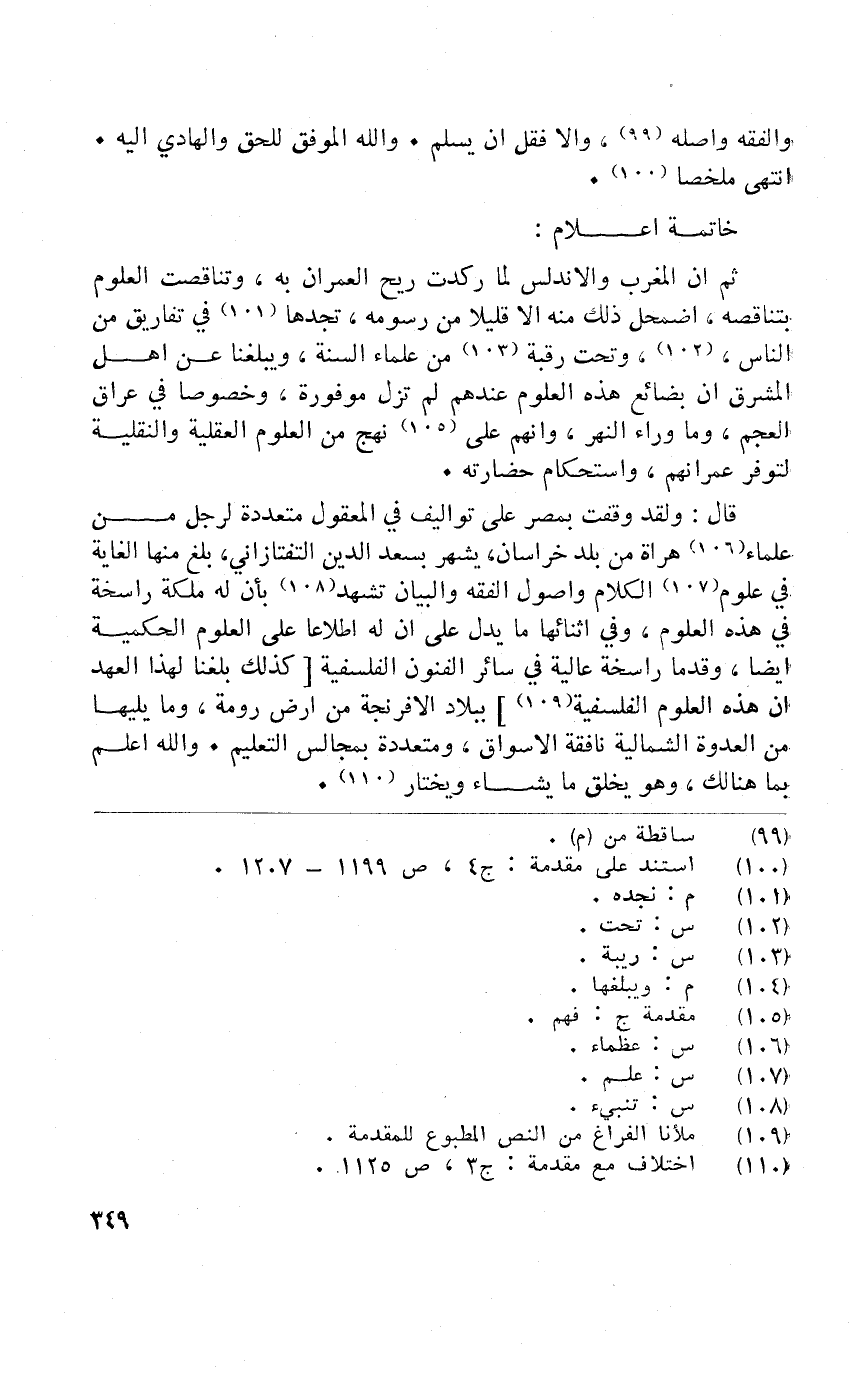 قَالَ وَلَقَد وقفت بِمصْر على تواليف فِي الْمَعْقُول مُتعَدِّدَة لرجل من عُلَمَاء هراة من بلد خُرَاسَان يشهر بِسَعْد الدّين التَّفْتَازَانِيّ بلغ مِنْهَا الْغَايَة فِي عُلُوم الْكَلَام واصول الْفِقْه وَالْبَيَان تشهد بِأَن لَهُ ملكة راسخة فِي هَذِه الْعُلُوم وَفِي اثنائها مَا يدل على أَن لَهُ اطلاعا على الْعُلُوم الْحكمِيَّة أَيْضا وقدما راسخة عالية فِي سَائِر الْفُنُون الفلسفية كَذَلِك بلغنَا لهَذَا الْعَهْد أَن هَذِه الْعُلُوم الفلسفية بِبِلَاد الافرنجة من ارْض رومة وَمَا يَليهَا من العدوة الشمالية نافقة الاسواق ومتعددة بمجالس التَّعْلِيم وَالله اعْلَم بِمَا هُنَالك وَهُوَ يخلق مَا يَشَاء ويختار