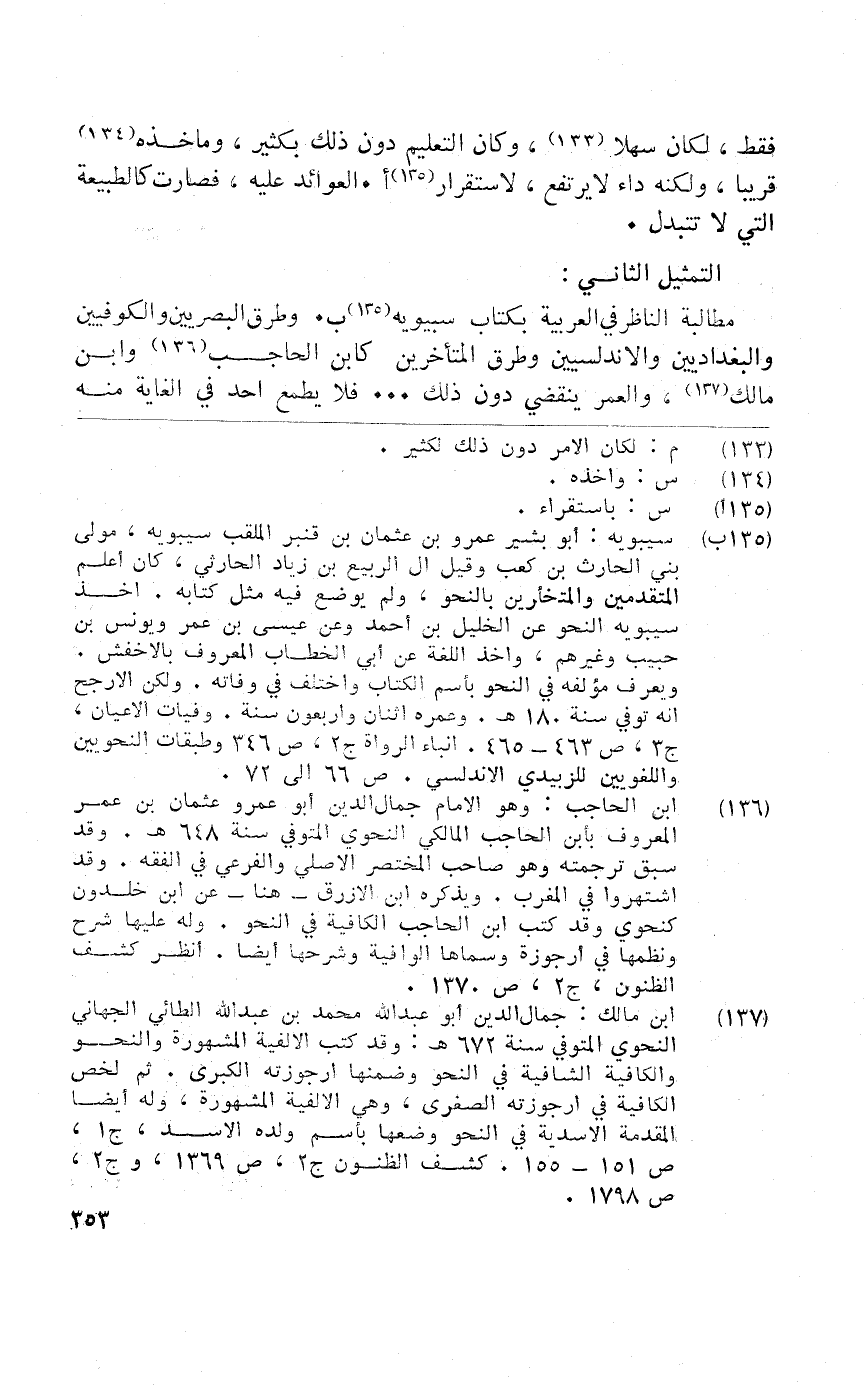 مُطَالبَة النَّاظر فِي الْعَرَبيَّة بِكِتَاب سبويه وطرق الْبَصرِيين والكوفيين والبغداديين والاندلسيين وطرق الْمُتَأَخِّرين كَابْن الْحَاجِب وَابْن مَالك والعمر يَنْقَضِي دون ذَلِك فَلَا يطْمع أحد فِي الْغَايَة مِنْهُ